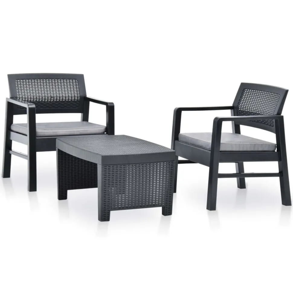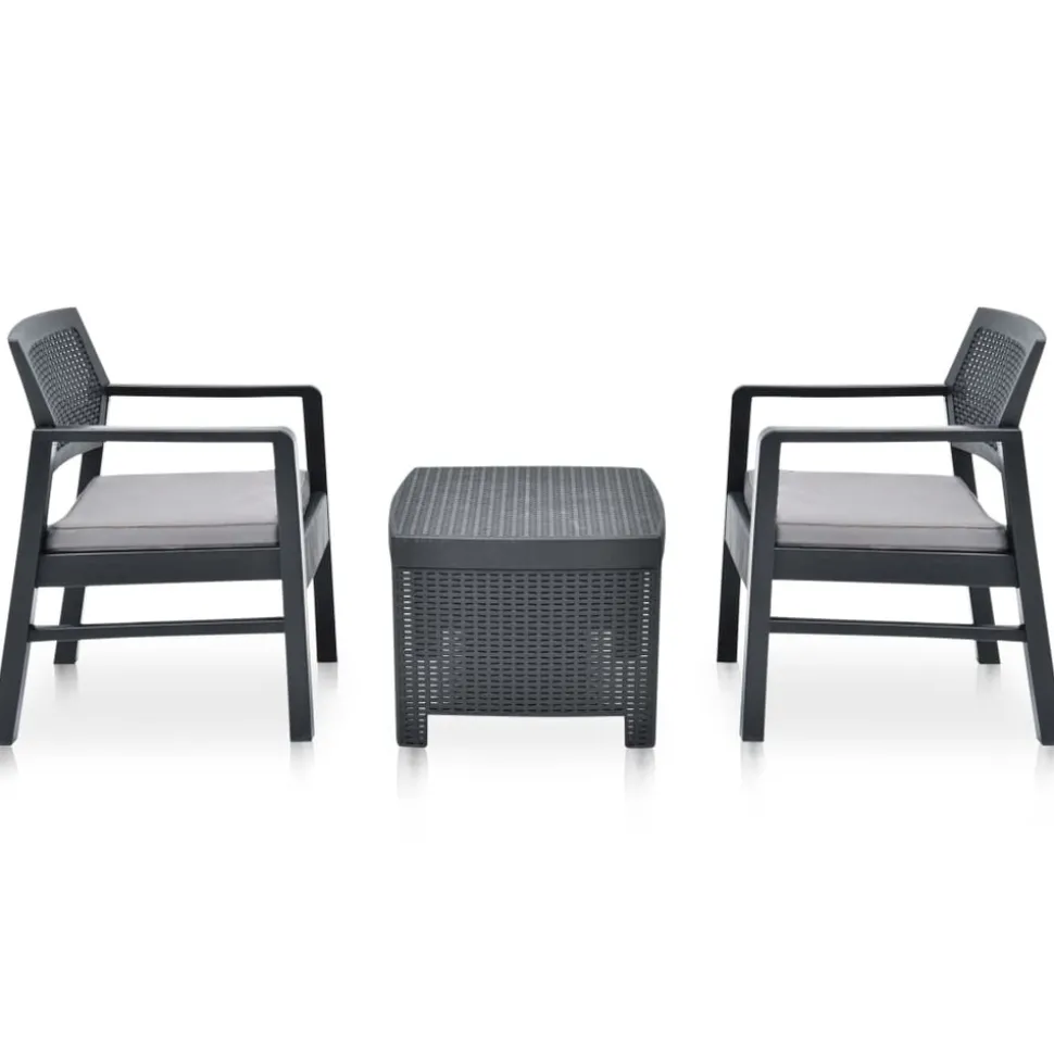 Notre ensemble de mobilier de jardin constitue le cadre idéal pour un agréable repas en plein air en famille ou entre amis, dans n’importe quel espace extérieur. Cet ensemble de mobilier est parfaitement adapté à une utilisation en plein air grâce à son matériau plastique solide mais léger, durable, résistant aux intempéries et facile à nettoyer. Les coussins de siège en polyester ajouteront un confort supplémentaire aux fauteuils. L’ensemble de mobilier de jardin est facile à assembler. La livraison inclut : 1 table, 2 fauteuils et 2 coussins de siège.