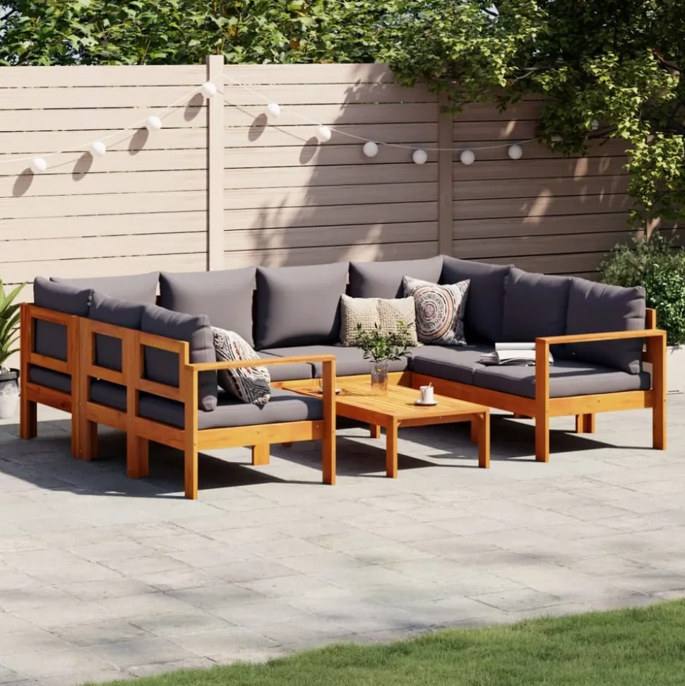 Cet ensemble de canapés de jardin est le complément parfait de votre arrière-cour, terrasse ou patio, offrant un espace confortable et accueillant pour discuter avec la famille et les amis ou simplement se détendre et profiter de l’extérieur. Matériau durable : le bois d’acacia massif est un matériau naturel magnifique. Le bois d’acacia un bois dur tropical, qui est dense, robuste et durable.Dessus stable et facile à nettoyer : cette table de jardin a un dessus en bois d’acacia robuste, durable et facile à nettoyer avec un chiffon humide.Expérience d’assise confortable : ce mobilier d’extérieur, doté de coussins épais, offre une expérience d’assise confortable. Housse amovible et lavable : ces coussins de siège sont dotés de housses amovibles pour un lavage et un entretien faciles.Conception modulaire : cet ensemble de meubles d’extérieur a une conception modulaire, ce qui le rend complètement flexible et facile à déplacer, afin que vous puissiez créer un agencement de meubles d’extérieur personnalisé. Bon à savoir :Pour que vos meubles d’extérieur restent beaux, nous vous recommandons de les protéger avec une housse imperméable.