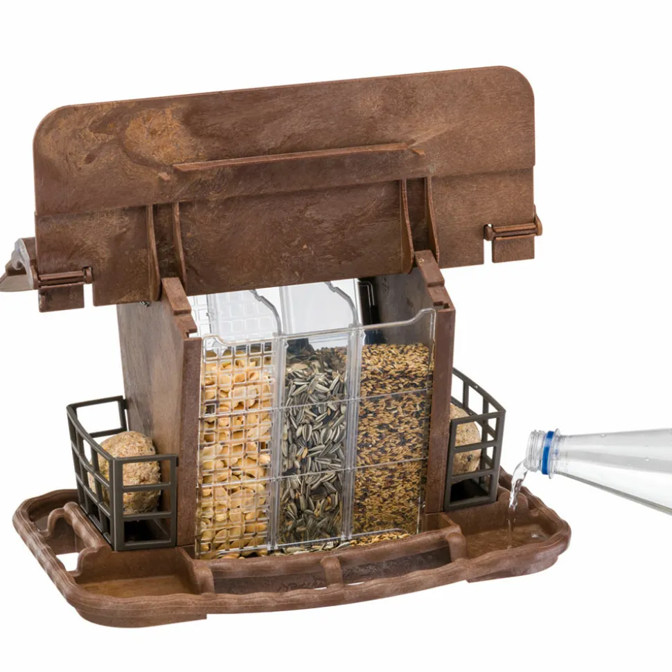 Mangeoire d’extérieur pour oiseaux en matériau non toxique et recyclable, durable et résistant aux intempéries, inattaquable par les parasites et hygiénique Convient pour fournir aux oiseaux sauvages différents types d’aliments, de graines ou de noisettes, boules de graisse ou d’eau. Elle peut également être utilisée comme abri sans les éléments transparents. Conception de la maison avec un toit en pente qui peut être ouvert et un perchoir confortable. Facile à remplir et nettoyer. Complet avec cordon pour l’accrocher aux arbres de votre jardin, terrasse ou porche. La mangeoire Jok peut être assemblée rapidement sans avoir besoin d’outils spéciaux. Également disponible dans d’autres modèles et formes. Dimensions complètes extérieures: 34 x 26 x h 23 cm.