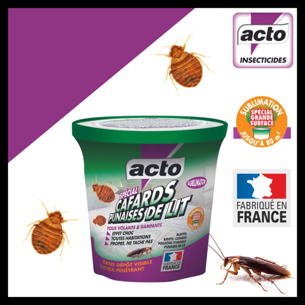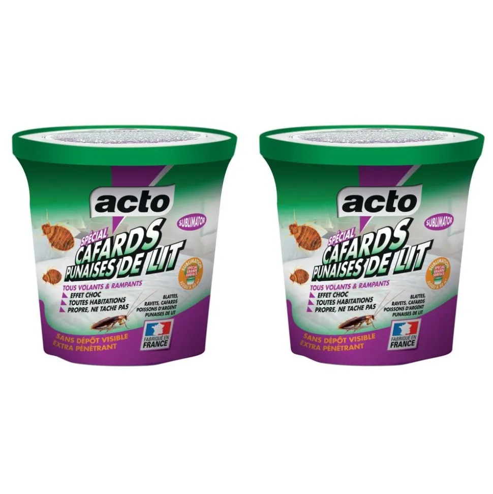 Le duo Acto SUBLIMATOR a été élaboré spécifiquement pour combattre efficacement les cafards et punaises de lit. De plus, il garantit une éradication des insectes volants et rampants présents lors de son utilisation.Mode d’emploi :Enlevez l’opercule et le couvercle de l’Acto SUBLIMATOR.Positionnez le diffuseur sur une surface non inflammable.Écartez tout matériau susceptible de s’enflammer sur 1,50 m autour.Allumez pendant 15 secondes puis patientez 4 heures. Après ce délai, ventilez la zone pendant minimum 60 minutes.Comment ça marche ? :La magie opère grâce au charbon actif qui, en chauffant, transforme la poudre insecticide en un gaz redoutable. En quelques minutes, il se propage dans toute la pièce. Ses effets persistent durant un mois entier, offrant tranquillité et sérénité.Composition :Ce produit est enrichi en perméthrine et géraniol, des composants reconnus pour leur efficacité contre les insectes. Bien que puissants, il est essentiel de suivre les directives d’utilisation pour éviter tout désagrément.Consignes de sécurité :Conservez hors de portée des enfants.Évitez d’inhaler les fumées.Utilisez des gants lors de la manipulation.En cas de contact, rincez abondamment.Dirigez-vous vers une déchetterie pour éliminer le produit après usage.Origine :Fabriqué avec fierté en France, le lot de 2 Acto SUBLIMATOR est parfait pour traiter de vastes espaces.Utilisez les biocides avec précaution. Avant toute utilisation, lisez l’étiquette et les informations concernant le produit. Produits dangereux : respectez les précautions d’emploi.