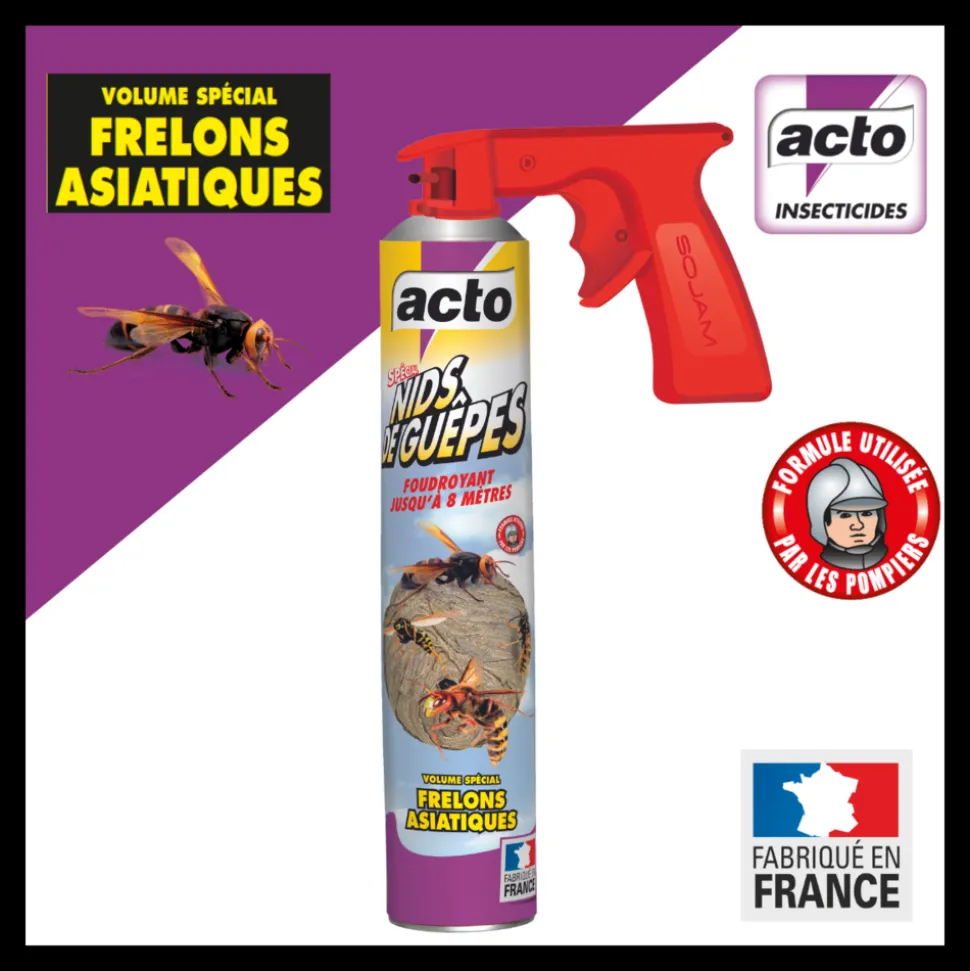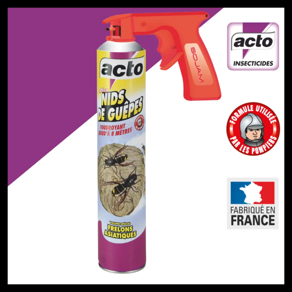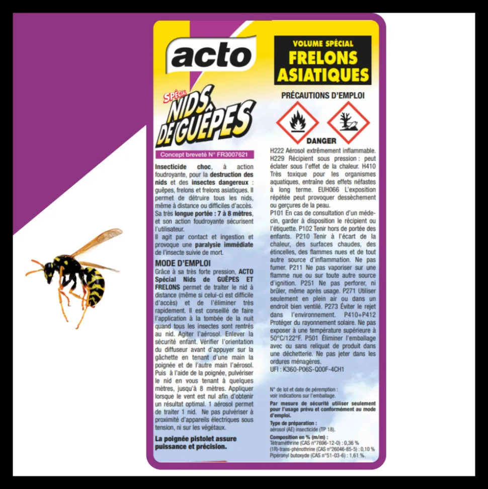 Fabriqué en France, l’Aérosol ACTO Spécial NIDS DE GUEPES est un outil indispensable dans la lutte contre les nids de guêpes et de frelons, y compris ceux difficiles d’accès. Ce produit a été conçu pour être très efficace, d’où son utilisation par les pompiers. Il fonctionne grâce à un système de propulsion au gaz comprimé qui assure une portée exceptionnelle jusqu’à 8 mètres. L’aérosol est idéal pour éliminer les essaims à distance, minimisant ainsi le risque de piqûres. Son action foudroyante paralyse immédiatement les insectes, provoquant leur mort.CaractéristiquesFabriqué en France : Garantie de qualité et de performanceUtilisé par les pompiers : Gage d’efficacité éprouvéeAction foudroyante : Paralyse immédiatement l’insecte, provoquant sa mortPortée longue distance : Propulse le liquide insecticide jusqu’à 8 mètresUtilisation sécurisée : Permet de détruire à distance les essaims, réduisant le risque de piqûrePoignée pistolet : Assure puissance et précisionConception brevetée : Formule unique renforcée par l’action synergisée du pipéronyl butoxydeCompositionL’Aérosol ACTO Spécial NIDS DE GUEPES est composé de :Tétraméthrine (CAS n°7696-12-0) : 0,36 %(1R)-trans-phénothrine (CAS n°26046-85-5) : 0,10 %Pipéronyl butoxyde (CAS n°51-03-6) : 1,61 %Mode d’emploiPour une utilisation optimale, il est conseillé de traiter le nid à la tombée de la nuit lorsque tous les insectes sont rentrés au nid. Agitez l’aérosol avant utilisation, retirez la sécurité enfant, vérifiez l’orientation du diffuseur, et appuyez sur la gâchette tout en tenant d’une main la poignée et de l’autre l’aérosol. Assurez-vous de vous tenir à une distance sécurisée, jusqu’à 8 mètres du nid, lorsque vous pulvérisez.Précautions d’emploiIl est important de lire attentivement les instructions avant utilisation. Ce produit est extrêmement inflammable et sous pression. Évitez toute exposition à la chaleur, aux flammes nues ou à toute autre source d’inflammation. Utilisez uniquement en plein air ou dans un endroit bien ventilé. En cas de contact avec les yeux, rincez avec précaution à l’eau pendant plusieurs minutes. Éliminez l’emballage conformément aux directives locales.vendu en lot de 2 aérosols Utilisez les biocides avec précaution. Avant toute utilisation, lisez l’étiquette et les informations concernant le produit. Produit dangereux : respectez les précautions d’emploi.