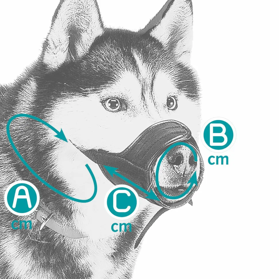 Muzzle Net est disponible en cinq formats et la taille adaptée à votre chien est établie en fonction de la longueur et de la circonférence du museau et de la circonférence de la tête du chien.