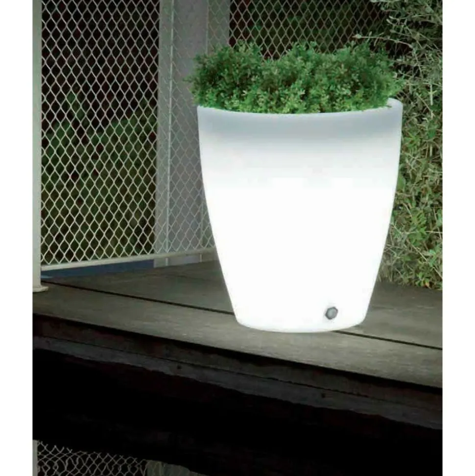 Le pot de fleur lumineux solaire Violeta 40, de 43 cm de hauteur, 40 cm de largeur, en plastique translucide blanc épais (poids environ 3 Kg à vide), est de haute qualité et fabriqué en Espagne. Un système électronique, en culot sous le pot, breveté, permet d’assurer la recharge de deux manières différentes :