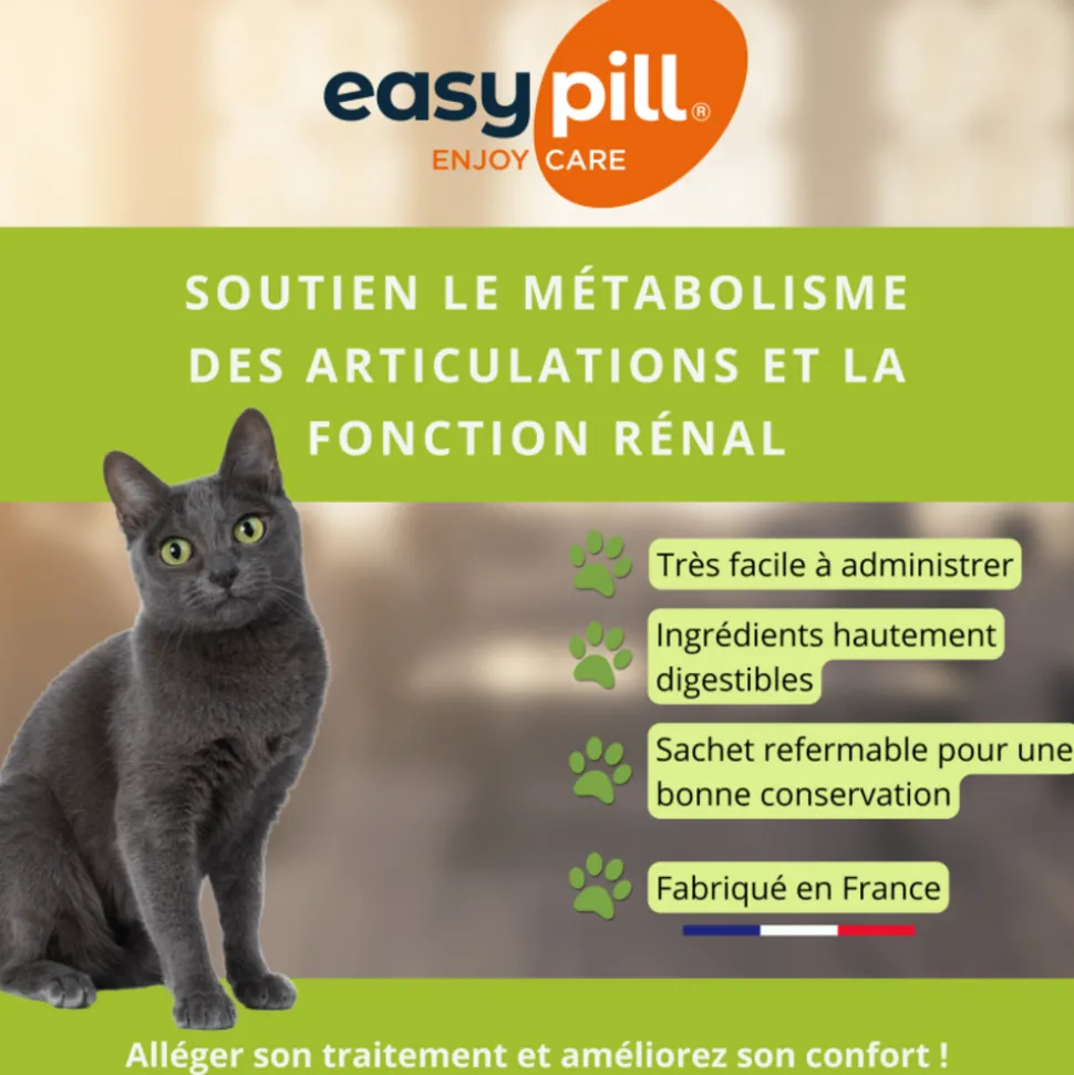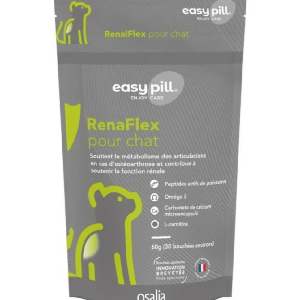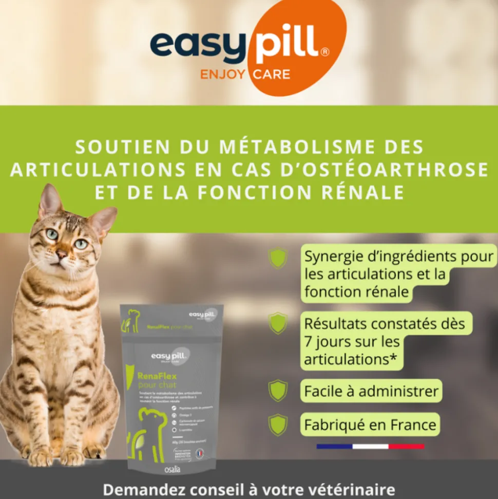 Easypill® Renaflex pour Chat est une solution spécialement formulée pour les chats souffrant d’ostéoarthrose tout en soutenant simultanément leur fonction rénale. Ce complément alimentaire contribue à améliorer le confort articulaire, la mobilité et la qualité de vie de votre animal grâce à l’action combinée de collagène de poisson hydrolysé (apportant des peptides bioactifs) et des oméga-3 (DHA). De plus, il favorise une fonction rénale optimale grâce au carbonate de calcium, qui aide à complexer le phosphore. Easypill® Renaflex contient également de la L-carnitine, bénéfique pour le métabolisme énergétique. Des résultats visibles, notamment une meilleure mobilité et des vocalises réduites liées à la douleur, ont été observés dès 7 jours d’utilisation.