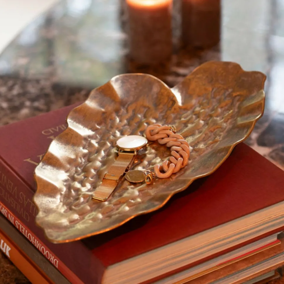 Dimensions : Taille 1 : L. 45 x l. 22 x H. 5 cmTaille 2 : L. 54 x l. 26 x H. 5 cmMatière : 100% MétalSpécificités :Déco & UtileLot de 2 vide-pochesDesign feuillePoids : 0,83 kgCouleur : Or