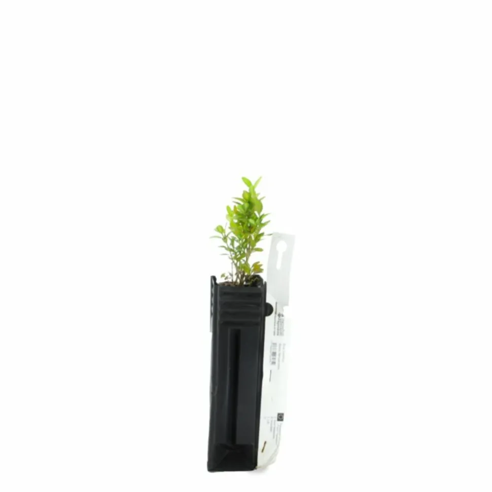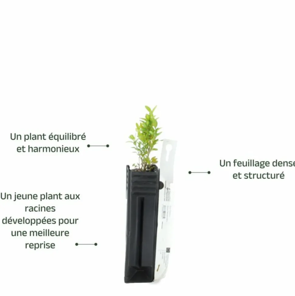 - Feuillage persistant dense : idéal pour les haies, bordures et topiaires.