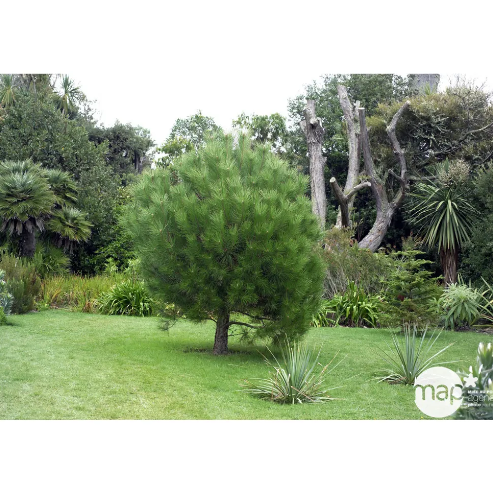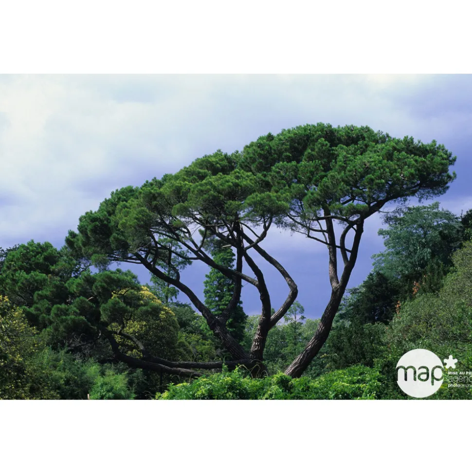 Originaire du bassin méditerranéen, ce pin pignon est un arbre typique de ces régions. Sa présence, dès l’Antiquité, dans les paysages latins lui a valu le surnom de « Pin d’Italie ». Est-il besoin de présenter ce « pin parasol » à la silhouette si caractéristique, cet emblème, avec le cyprès de provence, des régions méridionales ? Ce conifère charme tant par son port type, à cime étalée, d’un vert sombe aux reflets bleus, par son écorce rouge, profondément cannelée… que par les délicieux pignons que renferment ses cônes. Un superbe arbre à installer isolé ou en alignement.