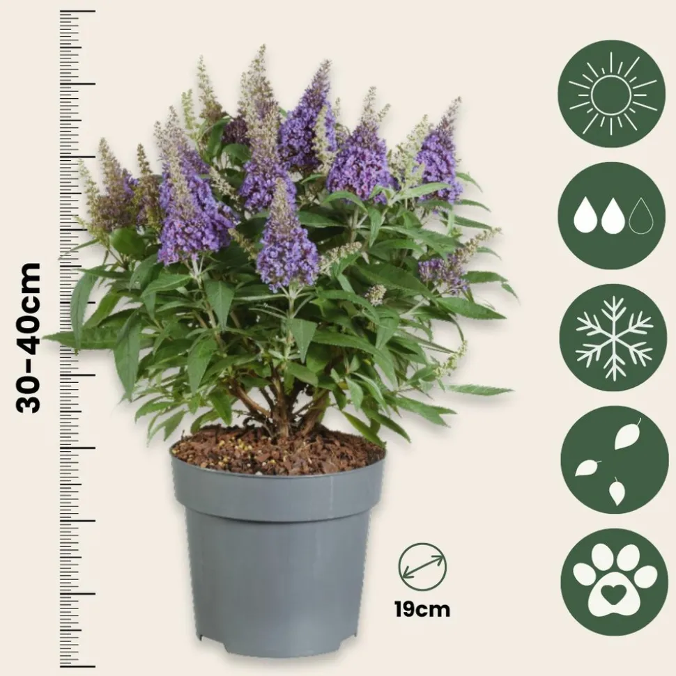 Le Buddleja ‘Little Lila’ est le bonbon lilas de la famille des bonbons aux papillons. Ces nouveaux buissons à papillons sont vraiment uniques ! Contrairement au buisson à papillons ‘normal’, ce buisson à papillons nain et rustique reste petit et compact. Il ne poussera pas beaucoup plus haut que 80 cm. Cette belle plante est un véritable paradis pour les papillons ! Pendant les mois d’été, elle est remplie de haut en bas de fleurs lilas qui répandent un délicieux parfum. Le Buddleja peut être placé à n’importe quel endroit où vous voulez des papillons, il peut être planté dans le jardin ou dans de beaux pots décoratifs sur la terrasse ou le balcon. Où que vous mettiez votre Buddleja, ce sera certainement un endroit bourdonnant !