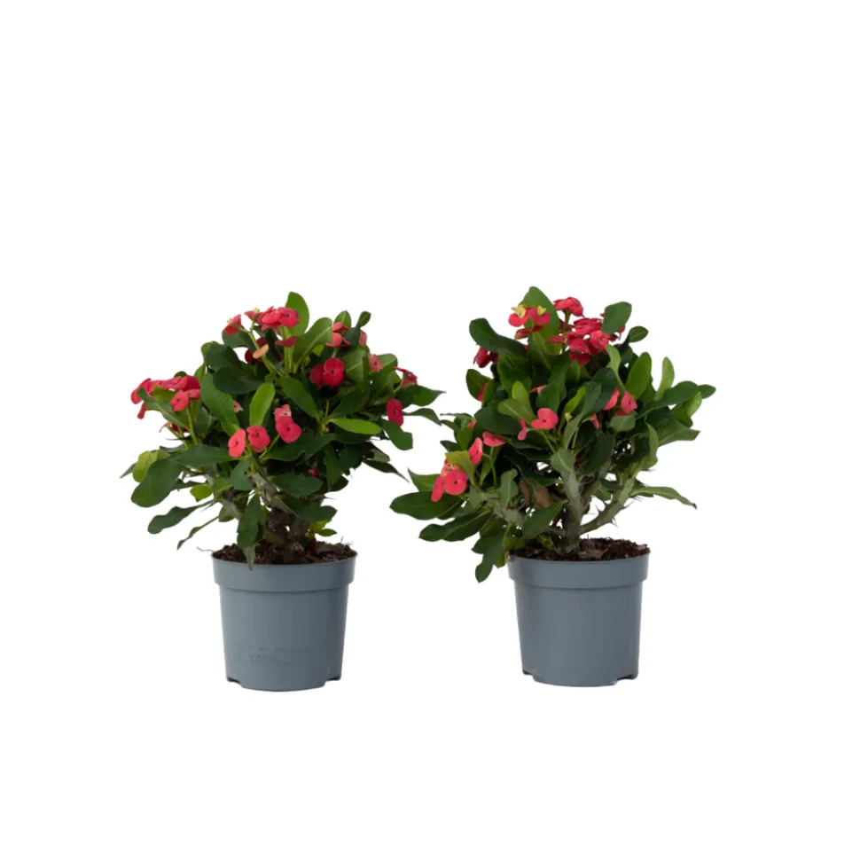 Euphorbia milii, plus connue sous le nom d’épine du Christ, est une plante succulente à fleurs originaire de Madagascar. On dit que la couronne du Christ est tissée à partir des branches de l’Euphorbia milii, ce qui lui vaut le nom d’épine du Christ. Cette plante est appréciée pour son faible entretien et sa tolérance à la sécheresse, de sorte que l’air sec dû au chauffage, par exemple, n’est pas un problème. L’Euphorbia milii fleurit de petites fleurs roses de mars à septembre. La plante est belle, mais il faut faire attention, car la sève toxique peut provoquer des irritations de la peau.