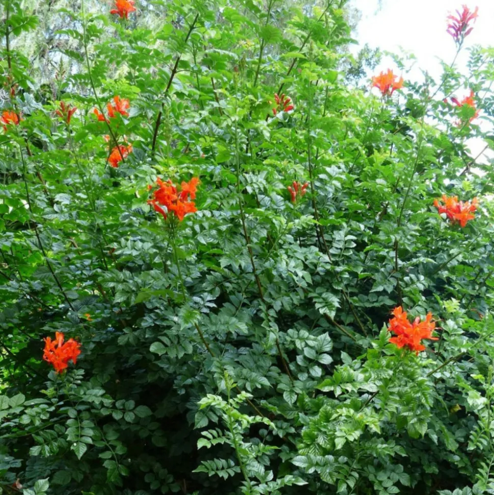 Tecomaria capensis, également connue sous le nom de chèvrefeuille du Cap ou de bignone du Cap, est une plante grimpante originaire d’Afrique du Sud. Appartenant à la famille des Bignoniaceae, cette plante est appréciée pour ses grappes de fleurs vibrantes et sa capacité à grimper et à couvrir des supports tels que des treillis, des clôtures et des pergolas.