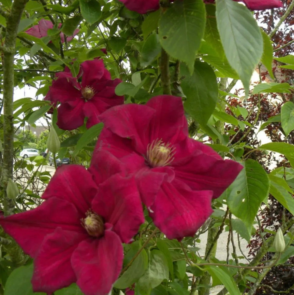 La Clématite Ernest Markham est une variété grimpante vigoureuse qui se distingue par sa floraison généreuse et spectaculaire. Ses grandes fleurs, de 10 à 15 cm de diamètre, arborent un rouge pourpre intense, velouté et légèrement bleuté. Elles s’épanouissent en abondance de mai à septembre, offrant un véritable spectacle de couleurs au jardin.