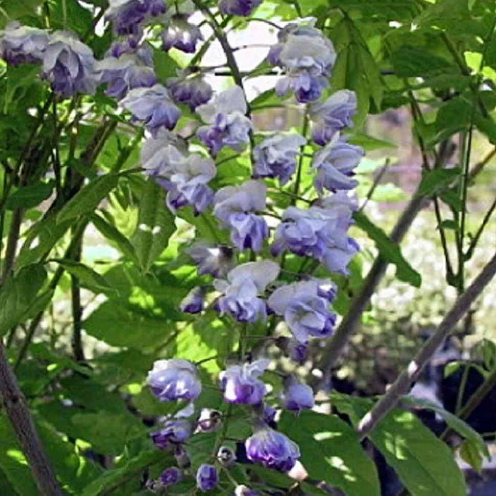 Cette variété produit des grappes de 20 à 30 cm bleus doubles. Son feuillage prend une jolie couleur jaune ocre à l’automne, agrémenté par de nombreuses gousses décoratives. Son parfum est léger.