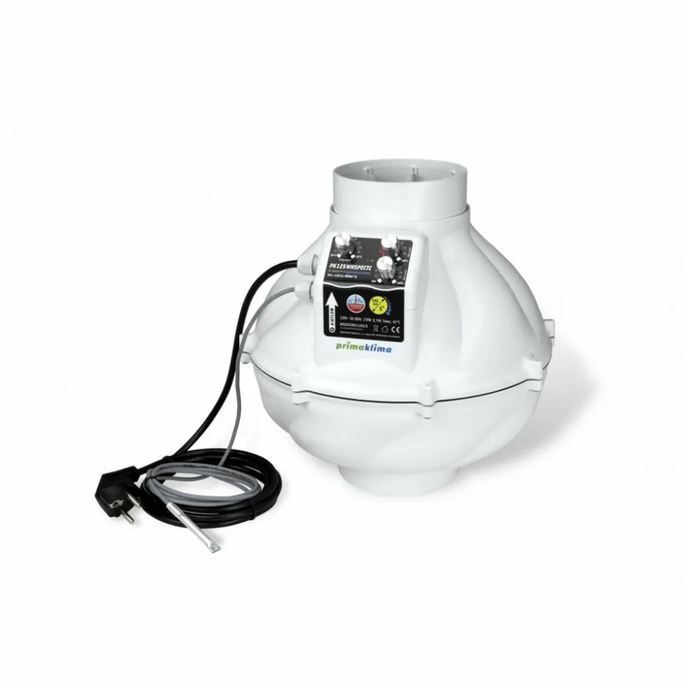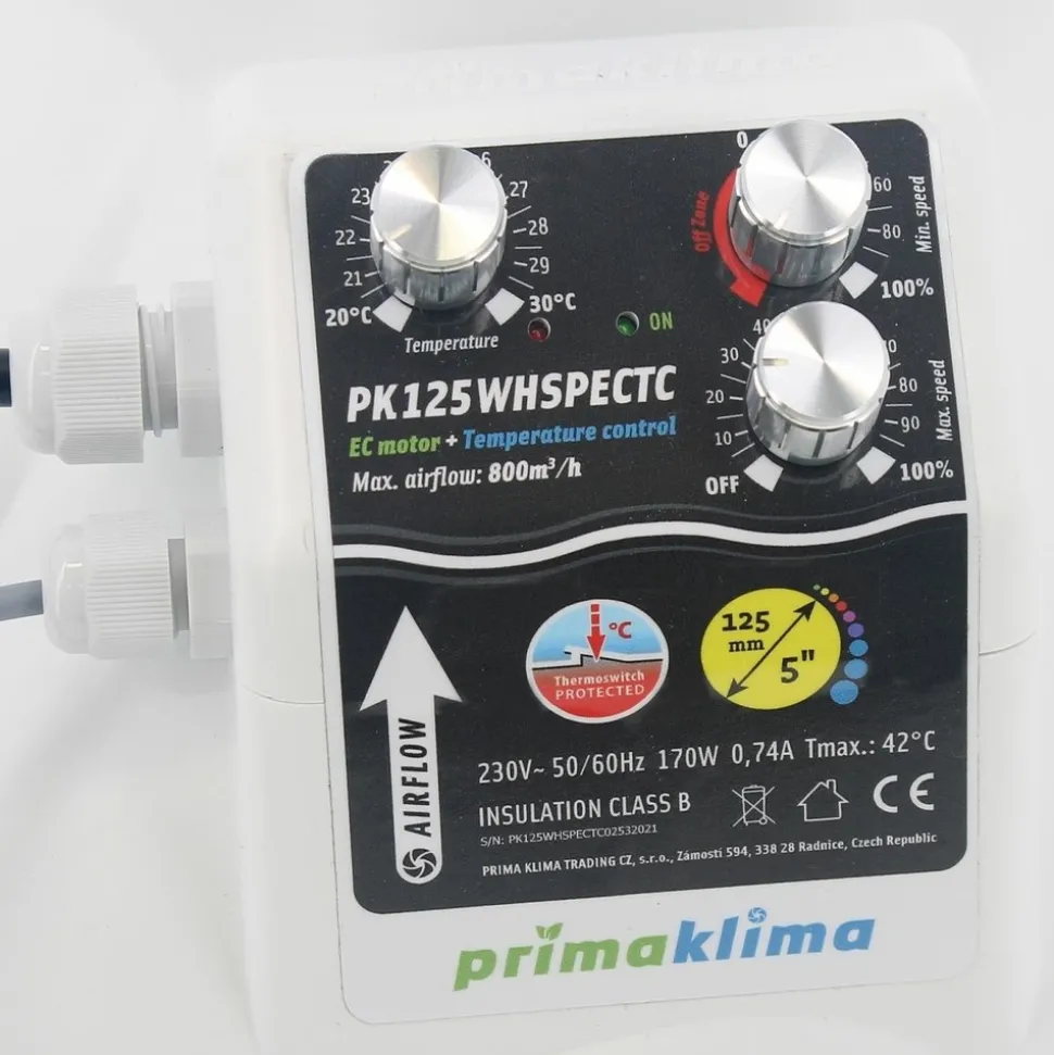 Extracteur Prima Klima Wishperblower insonorisé et thermo-contrôlé au débit d’air max de 800m3/h avec diamètre de connexion 125mm. La conception aérodynamique, le système de silencieux intégré, les roulements à billes et la nouvelle forme des pales de ventilation rendent cet extracteur d’air 2.5 fois plus silencieux et 40% plus puissant que tout autre produit équipé de moteur AC.