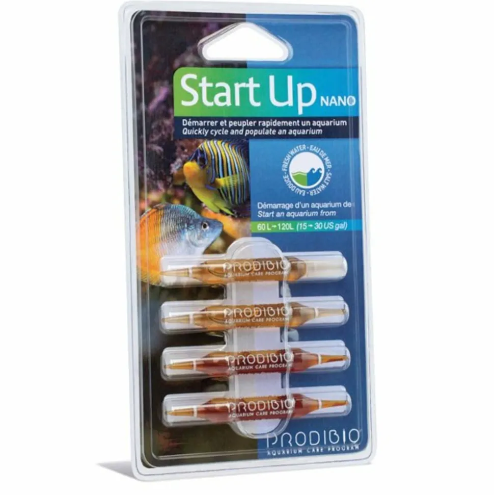 Start up de prodibio, regroupe les produits biodigest start et stop ammo start afin d’optimiser le démarrage de l’aquarium d’eau douce ou marin.ce kit d’ensemencement permet de démarrer un aquarium rapidement et en toute sécurité pour les poissons et invertébrés.nos bactéries vivantes se mettent immédiatement au travail au contact de l’oxygène présent dans l’eau, pas de temps de latence ou de réactivation.start up vous permet d’introduire rapidement vos premiers habitants dans votre nouvel aquarium au bout deheures pour aquarium d’eau douce’ au bout de 12 heures pour un aquarium eau de merprivilégier les espèces les plus robustes et limiter leur nombre.biodigest start est composé de souches bactériennes naturelles nitrifiantes, dénitrifiantes et facultatives sélectionnées pour leur capacitéinitier très rapidement le cycle de l’azote et donctransformer l’ammoniaque en nitrites, les nitrites en nitrates et les nitrates en azote.ces bactéries travaillent en équipe, chacune des souches terminant le travail commencé par d’autres.stop ammo start est un produitbase d’extraits de plantes spécifiques dont la principale propriété permet de piéger l’azote de l’ammoniac et de le transformer en composés inoffensifs.