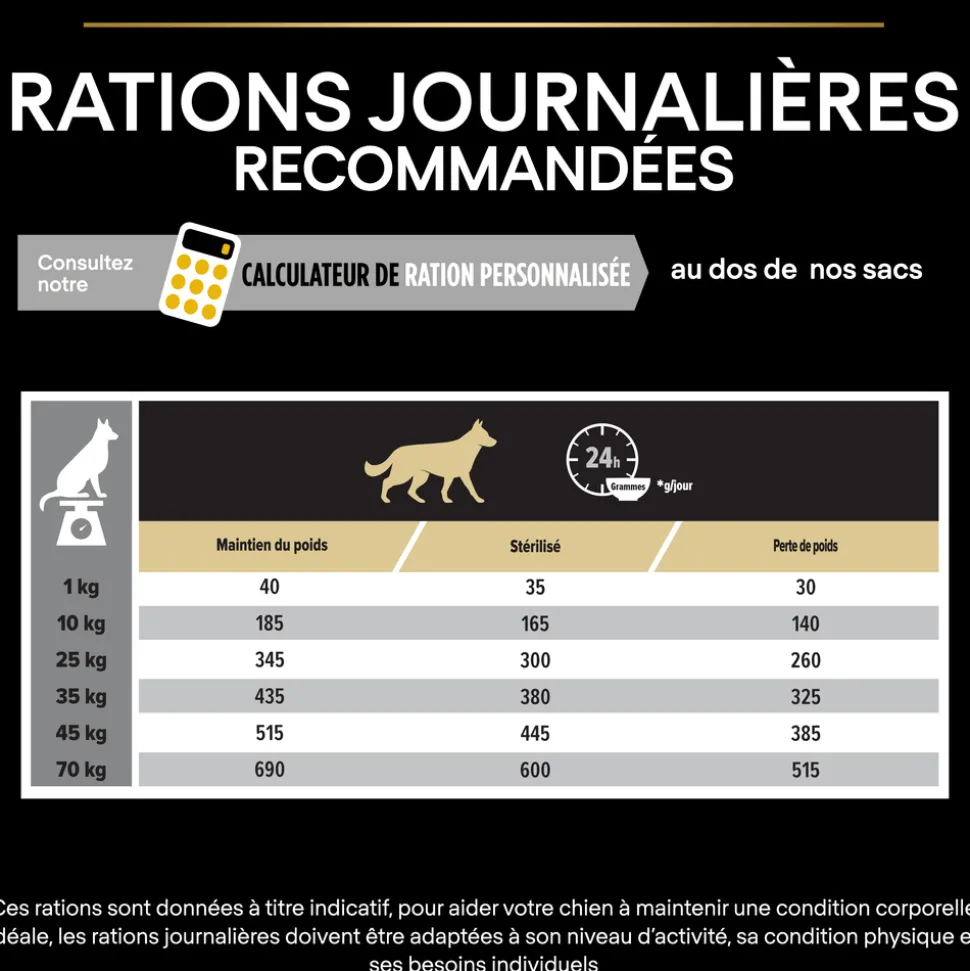 Poids du chienMaintien du poids Chien stérilisé Perte de poids*1-10 kg 45-200 35-175 30-15010-25 kg 200-370 175-320 150-27525-35 kg 370-460 320-400 275-34535-45 kg 460-545 400-475 345-41045-70 kg 545-735 475-640 410-550Mode d’emploi : Voir le tableau des rations journalières recommandées (g/jour) pour le maintien ou laperte de poids*.Ces rations sont données à titre indicatif.Maintien du poids :pour aider votre chienà maintenir une condition corporelle idéale, les rations journalières doivent être adaptées à l’activité de l’animal, sa condition physique etses besoins individuels.Si votre chien esten surpoids :respectezla ration journalière recommandée etajustez de manière à obtenir une perte de poids mensuelled’environ 2 à 4% de son poids.De l’eau fraîche et propre doit toujours être à la disposition de votre chien.Pour surveiller la santé de votre chien, consultez régulièrement votre vétérinaire.* CH :gestion du poids.