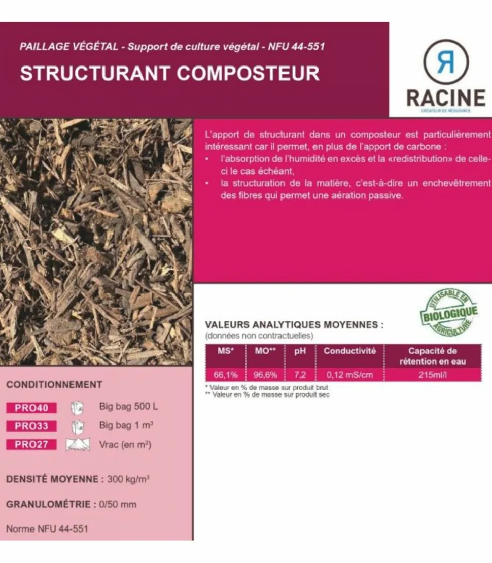 Le structurant composteur, conforme à la norme NFU 44-551, est un paillage végétal conçu pour améliorer l’efficacité du compostage domestique. Ce produit est disponible en big bag de 500 L et 1 m³, avec une densité moyenne de 300 kg/m³ et une granulométrie de 0/50 mm, assurant une distribution homogène et une gestion optimale de l’humidité dans les composteurs.