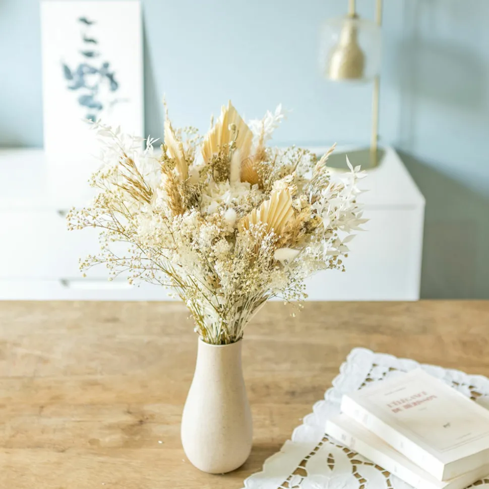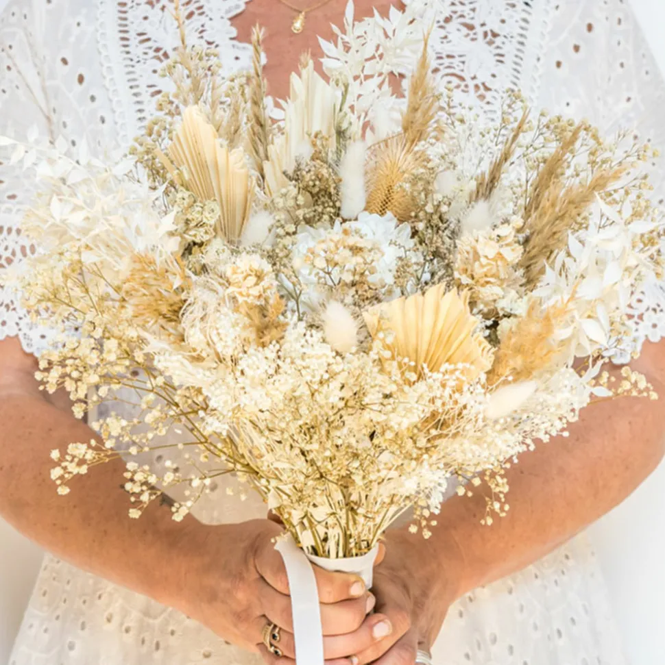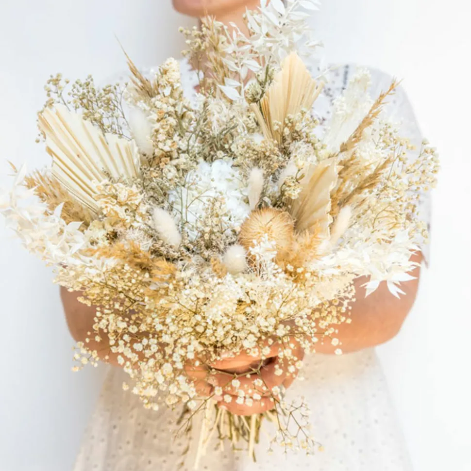 Les grandes palmes blanches tranchent avec la rondeur de l’hortensia blanc situé au centre. Le gypsophile naturel, les tiges de delphinium et les herbes de pampa beige font ressortir la blancheur des autres variétés et donnent du relief à ce bouquet de fleurs séchées. Le piquant des têtes de chardons tranchent avec la douceur du lagurus blanc et la rondeur des têtes de fenouil, donnant ainsi du caractère à l’ensemble. Les grandes tiges de ruscus blanc bordent ce bouquets de fleurs séchées pour un résultat aussi élégant que naturel.Ce bouquet de fleurs séchées est réalisé à la main dans notre atelier de la région parisienne avec des plantes naturelles séchées ou stabilisées à la glycérine végétale. Avantages : longévité, entretien facile, et diversité de couleurs. Nos bouquets sont faits pour durer. Vous pourrez les conserver plusieurs années.Composition du bouquet :– Limonium naturel– Chardons– Statice vanille– Herbes de pampa– Palm spear– Ruscus blanc– Delphinium blanc– Hortensia blanc– Lagurus blanc– Gypsophile blanc– Fenouil secTaille du bouquet :Hauteur : env. 50 cm, Diamètre env.25 cm