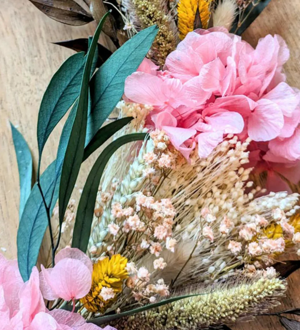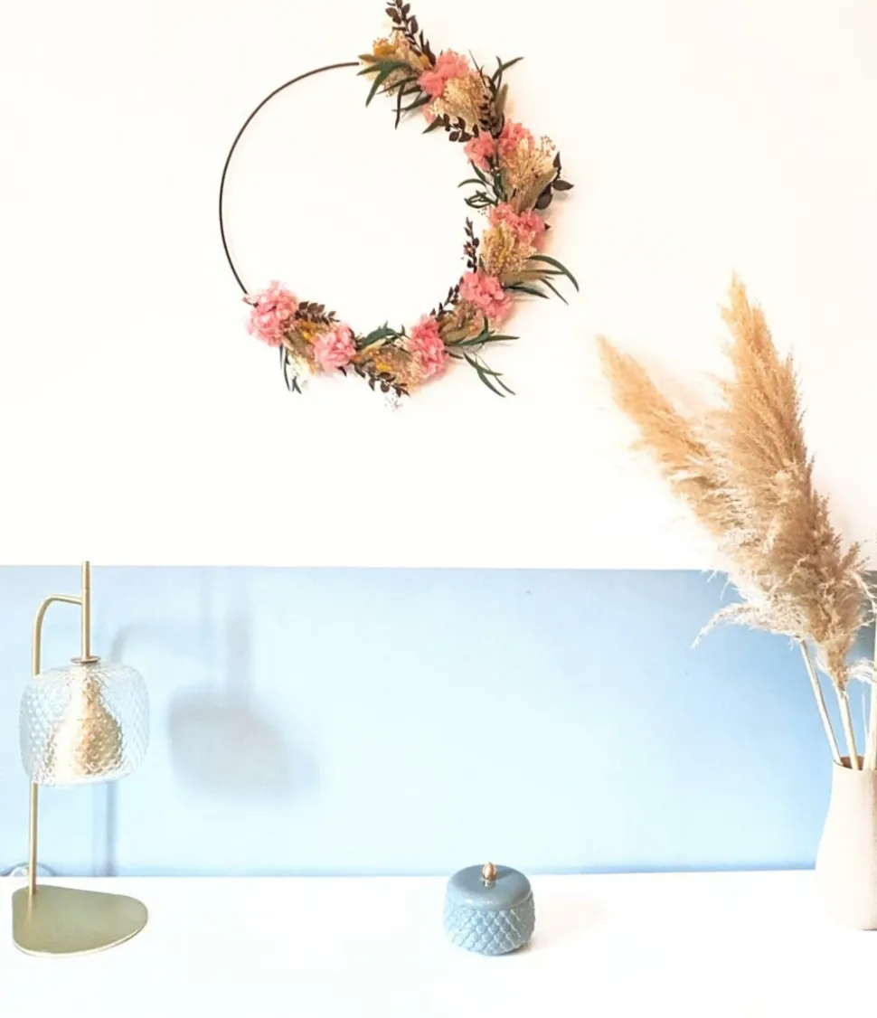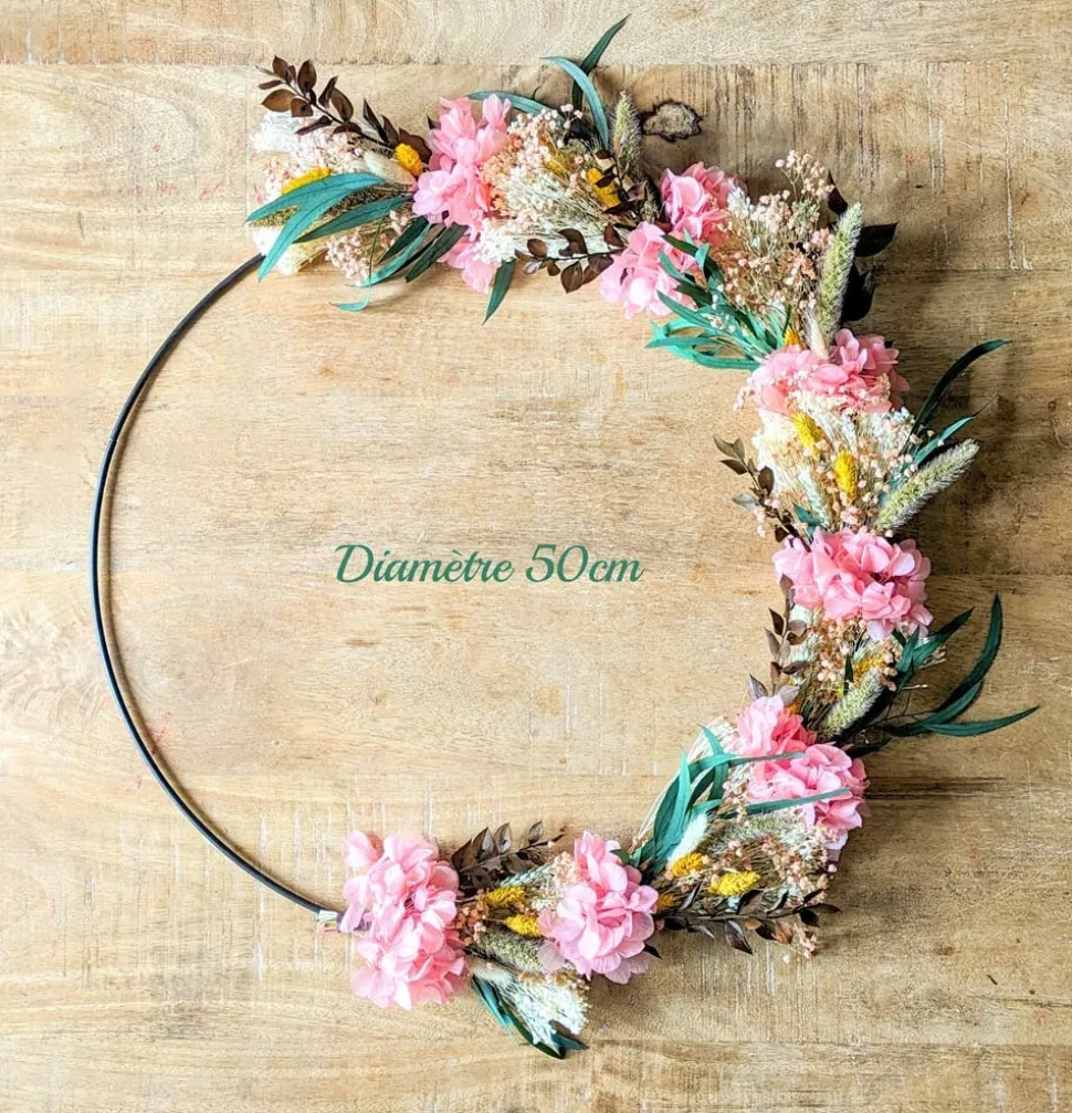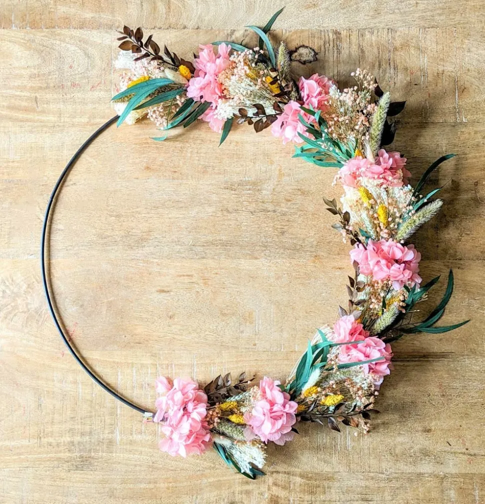 Fleurissez durablement votre intérieur grâce à cette couronne de fleurs séchées à la fois élégante et délicate.Les fleurs d’hortensia rose ponctuent cette couronne de fleurs séchées tandis que les légères fleurs de gypsophile rose donnent un côté vaporeux et élégant. Les longues feuilles d’eucalyptus willow et de ruscus brun bordent cette couronne de fleurs séchées tandis que les rappels de tiges de sétaire et de blé donnent un côté champêtre. Les fleurs de phalaris jaune réveillent l’ensemble pour un résultat à la fois gai et élégant.Accrochée simplement à un mur, déposée au centre d’une table, posée sur un coin de meuble ou à l’arrière d’une chaise, cette couronne de fleurs séchées donnera une touche poétique et délicate à votre décoration.Toutes nos couronnes de fleurs séchées sont uniques. Nous les confectionnons délicatement à la main et à la commande dans notre atelier de la région parisienne. Elles sont réalisées à partir de plantes naturelles séchées ou stabilisées avec de la glycérine, de l’eau et des colorants alimentaires. Ces plantes présentent de nombreux avantages : longévité, facilité d’entretien (rien à faire) et variété de couleurs. Vous pourrez les conserver plusieurs années !Composition :-Hortensia rose-Phalaris jaune-Broom blanc-Eucalyptus willow-Gypsopghile rose-Sétaire-Blé-Ruscus brunTaille: Diamètre 50cm (hors fleurs)