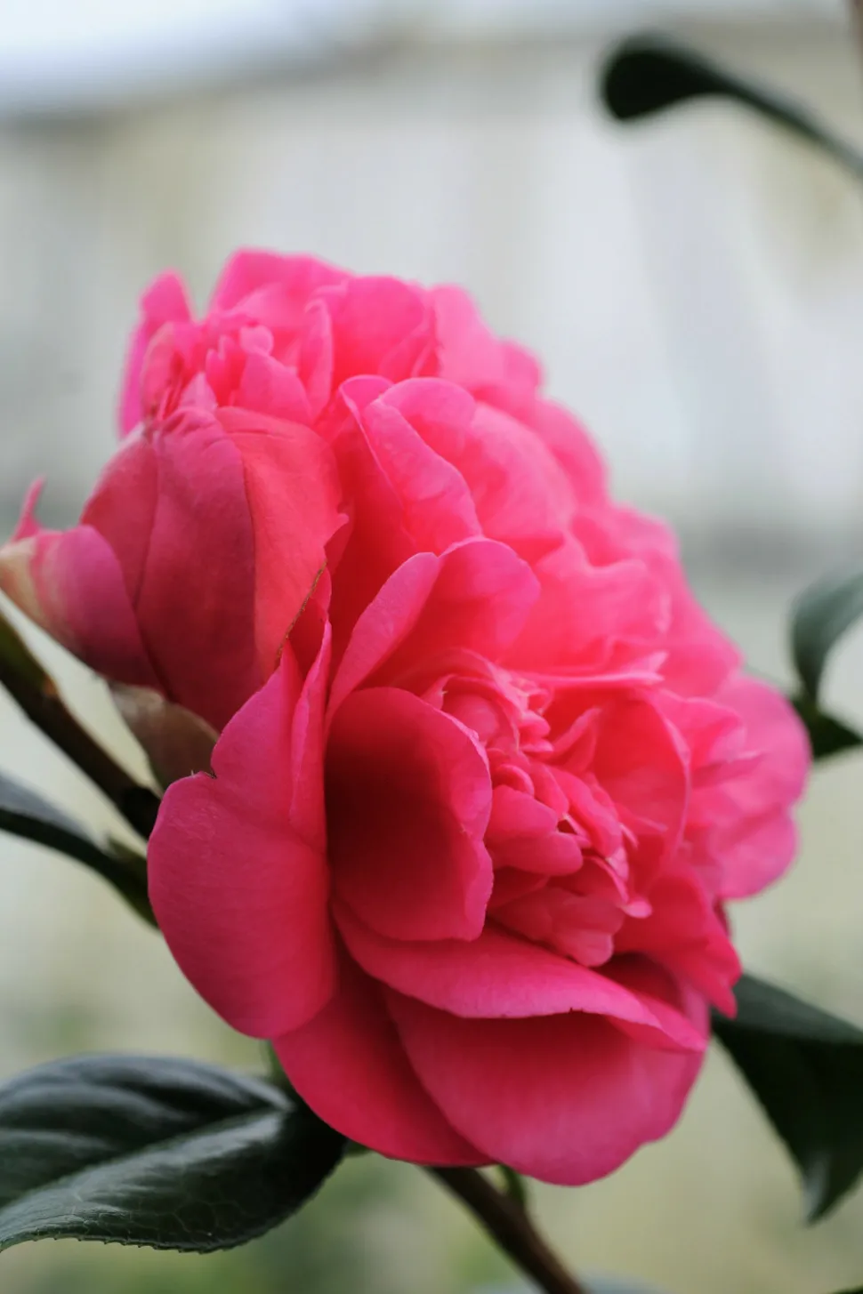 (C. saluenensis x C. japonica) Végétation compacte et érigée, feuillage sombre, floraison généreuse. Sa grande fleur ressemble à une pivoine d’un rose vif carminé. Il se comporte bien en haie et en pot.