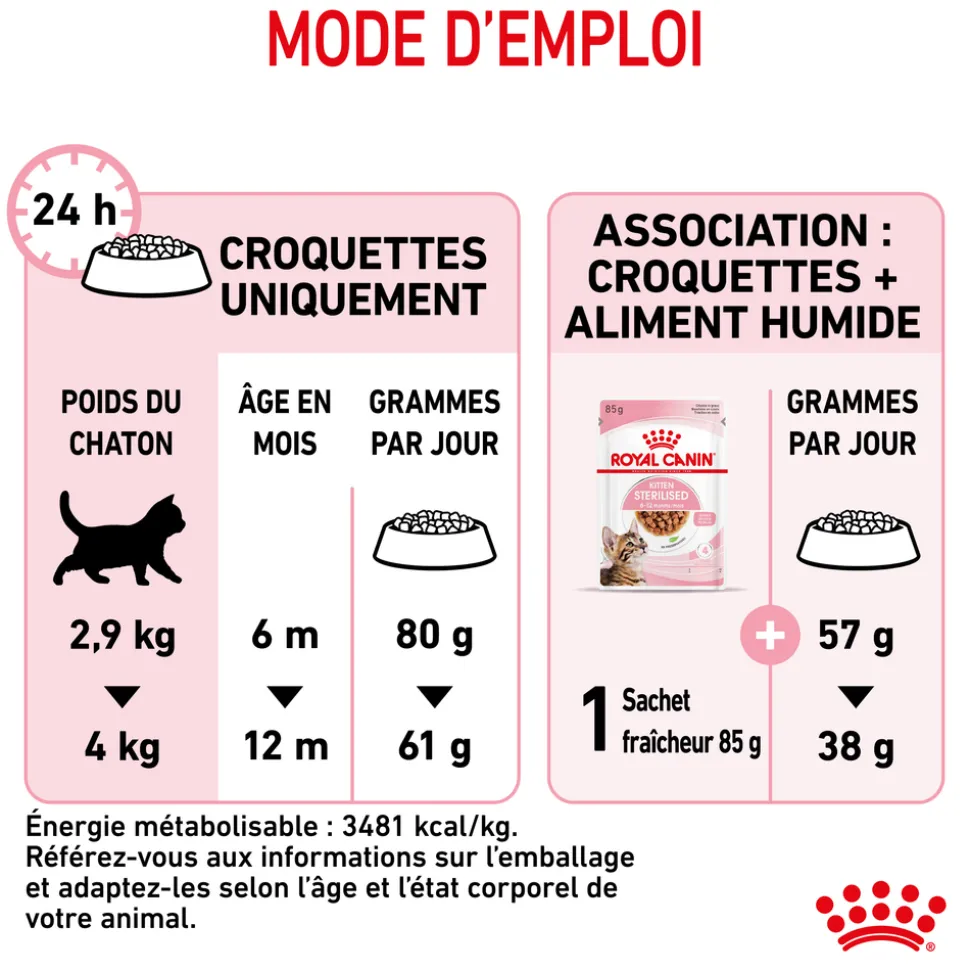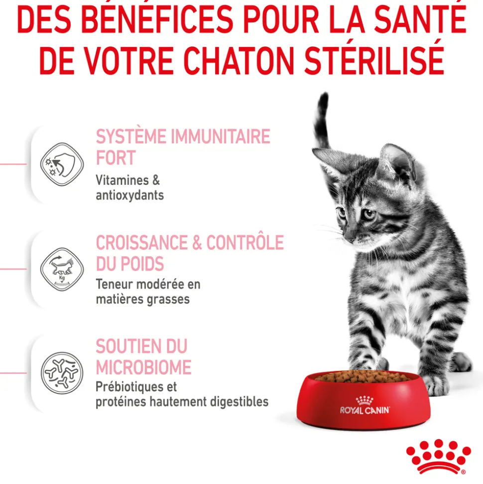 Ces croquettes représentent un repas complet et équilibré qui convient parfaitement aux chatons stérilisés âgés de 6 à 12 mois.