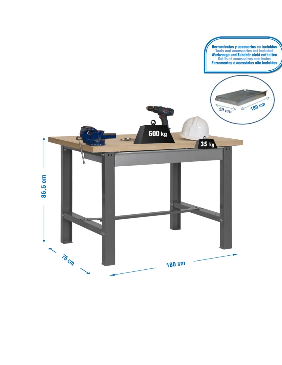 Établi métallique avec couleur gris/bois et une capacité de charge max par plateau de 800 kg. le nombre de plateaux est de 1. Mesures (hauteur x largeur x profondeur) 865x1800x750 mm. Plateaux en agglomérat de 12 mm d’épaisseur. Produit espagnol de qualité européenne, vous pouvez trouver les instructions à l’intérieur ou dans le lien suivant: https://www.youtube.com/watch?v=GpZpB8AIjro