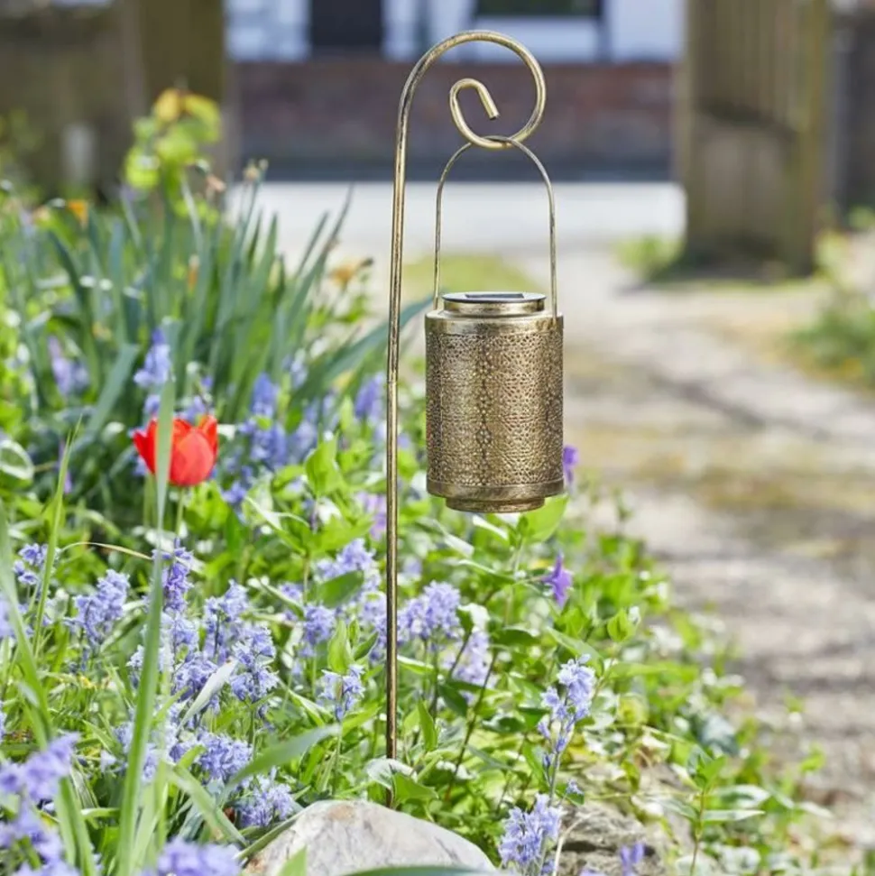 Caractéristiques principales de lanternes solaires suspendues Rabat en métal effet doré à piquer. LDS574 :