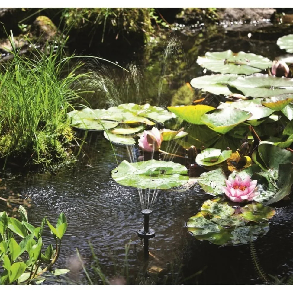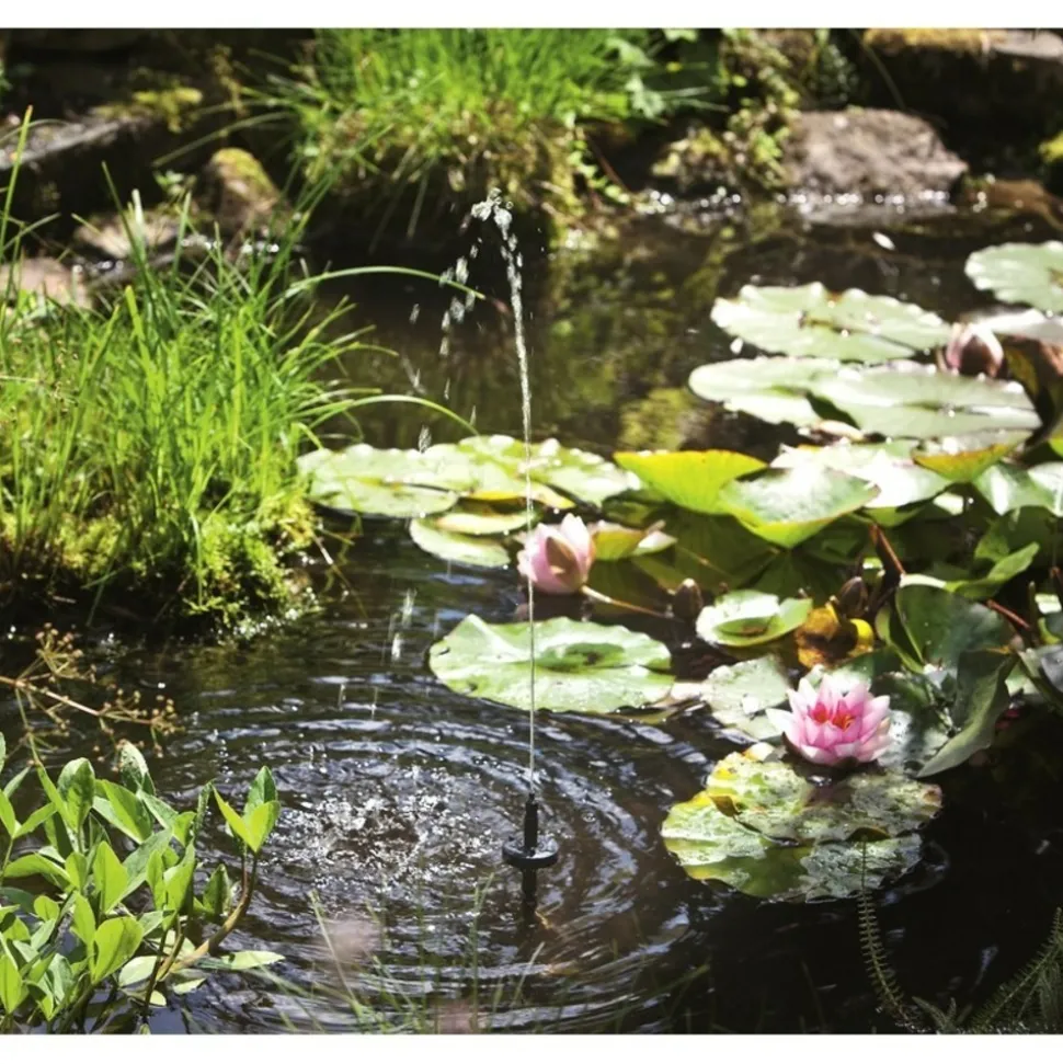 Ce système de pompage solaire avec batterie et anneau LED permet de faire de jolis jets d’eau décoratifs et oxygénant. Le filtre permet d’éviter le bouchage des petits orifices des gicleurs, évitant ainsi la déformation du jet et le besoin fréquent de nettoyage. En fonction de la dimension du bassin, il participera aussi à la filtration mécanique et biologique (bactéries) du bassin, en complément de plantes aquatiques qu’il est toujours recommandé de mettre.