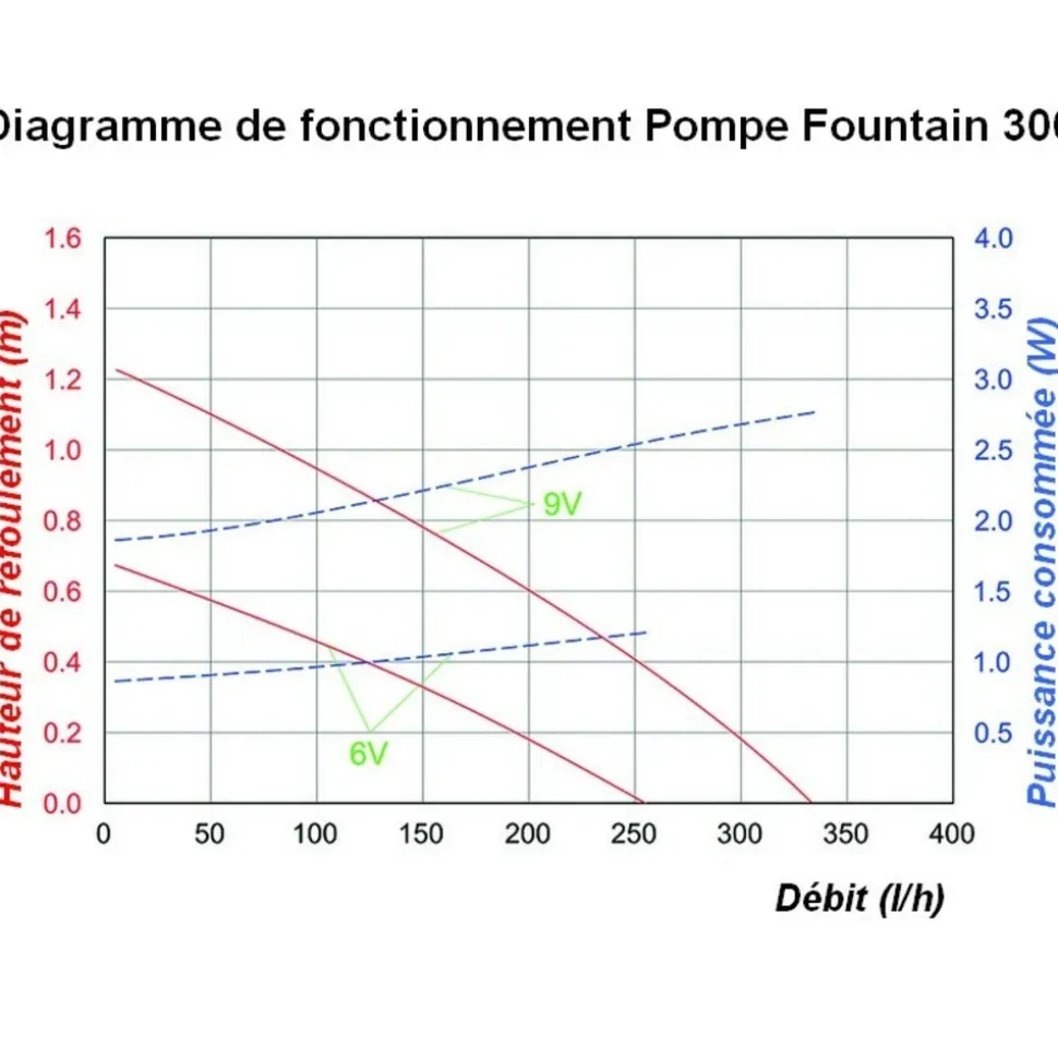- d’une pompe basse tension, avec protection marche à sec, 5 mètres de câble, débit maxi : 250 l / heure en réglage 6V (tension de sortie batterie réglable) et jusqu’à 330 l/h en position 9V, réglage conseillé l’été seulement, en situation très ensoleillée, car plus énergivore.