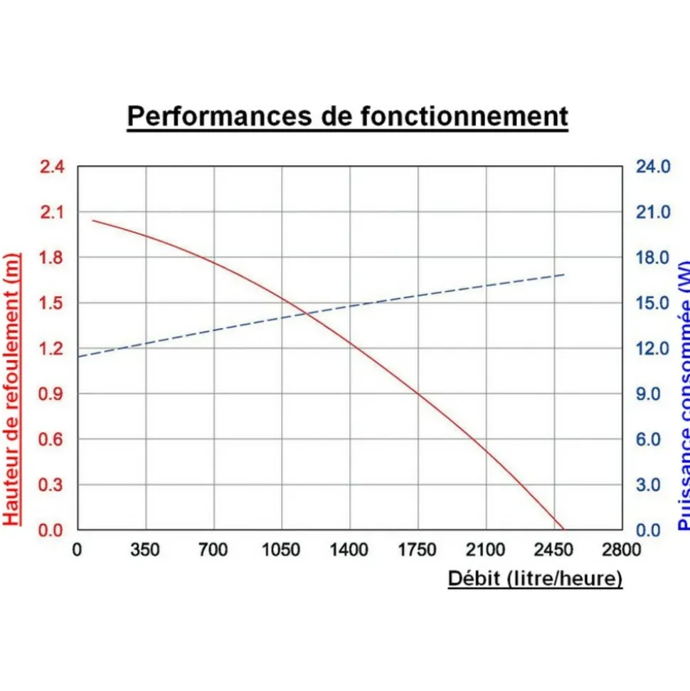 Ce kit de pompage solaire inclut une pompe basse tension, à immerger, de débit maxi 2500 litres par heure. Le débit va diminuer en fonction de la hauteur de remontée d’eau ou dénivelé (voir diagramme). 5 mètres de tuyau souple, diamètre 25 mm, sont inclus au kit pour une adaptation parfaite à la pompe et vous permettre de réaliser immédiatement votre aménagement.