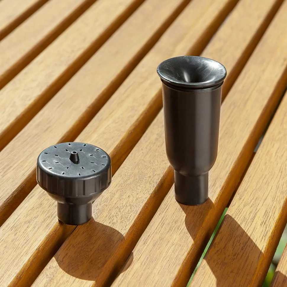 - Fournie avec 4 raccords tubulure et 2 embouts pour réaliser 3 types de jet d’eau (libre, fin plusieurs niveaux, cloche).