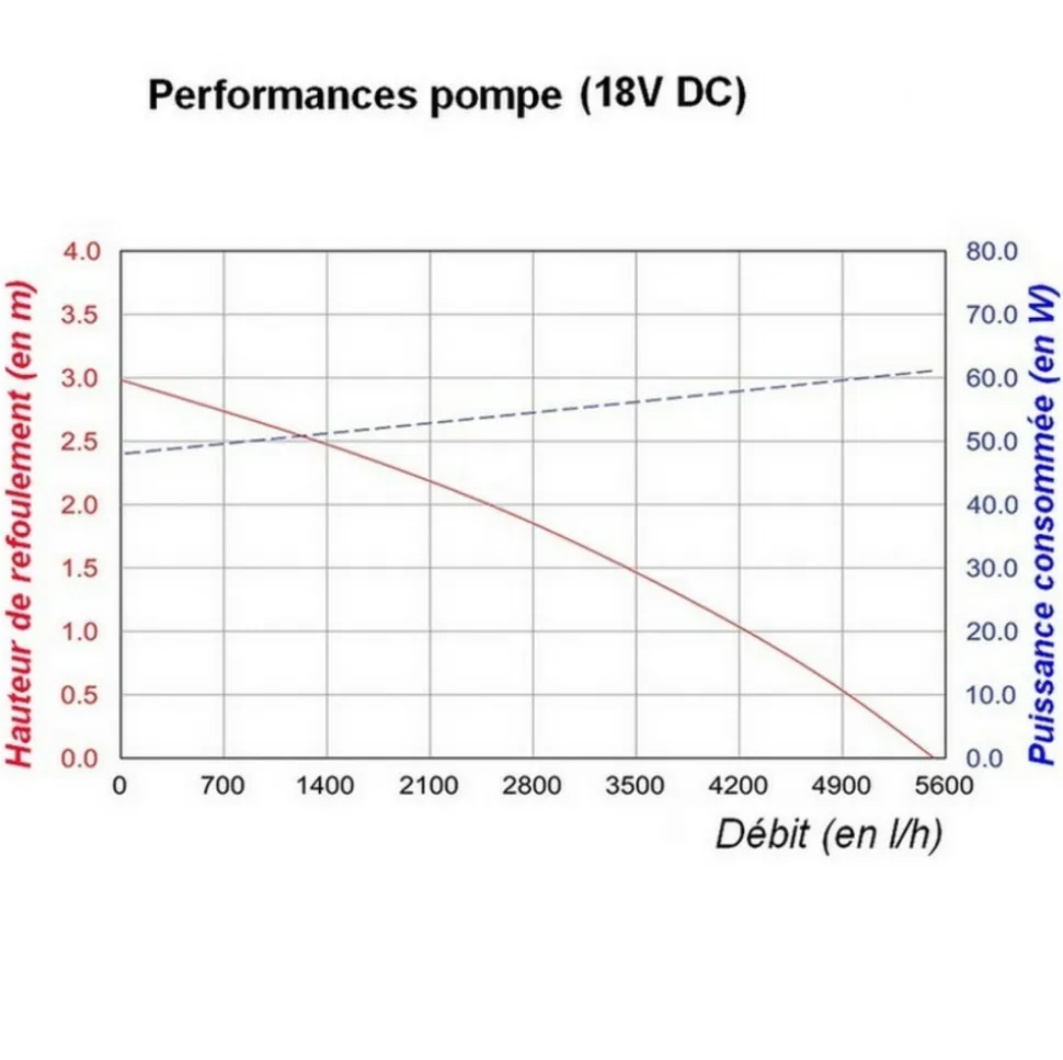 Ce kit de pompage solaire puissant, Premium 5000L-150W, inclut une pompe basse tension (18V DC, moteur à courant continu sans balai, pompe fiable) à immerger, de débit maxi 5000 litres par heure. Le débit diminue en fonction de la hauteur de remonté d’eau ou dénivelé (voir diagramme ci-dessus) que nous conseillons de limiter à 2 mètres maxi pour garder un débit intéressant. 5 mètres de tuyau souple annelé, diamètre 32mm, complètent le kit, pour une adaptation parfaite à la pompe et vous permettre de réaliser immédiatement votre installation.