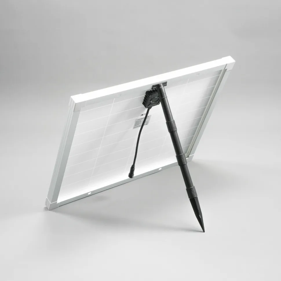 Conseils d’installation du kit pompe solaire bassin gros débit Premium 5000-150W: Placez les 3 modules solaires alignés, au soleil, exposition sud, sans ombre, inclinaison environ 30 à 50 degrés. Si le câble de 5 mètres fourni avec la pompe s’avère insuffisant, utilisez une rallonge de 5 mètres: voir rubrique Ils ont aussi acheté ci-dessous. Les modules solaires sont fournis avec un pied d’appui et d’inclinaison pour installation et test rapide. Nous recommandons cependant une installation plus pérenne, à réaliser en fonction de votre environnement, situation et aménagement. Il est assez simple de créer un support rigide se fixant sur le cadre aluminium des panneaux solaires. La pompe pourra être posée, en fonction de la profondeur de votre pièce d’eau, sur briques, pierres, parpaing. Il faut éviter de la poser tout au fond du bassin.