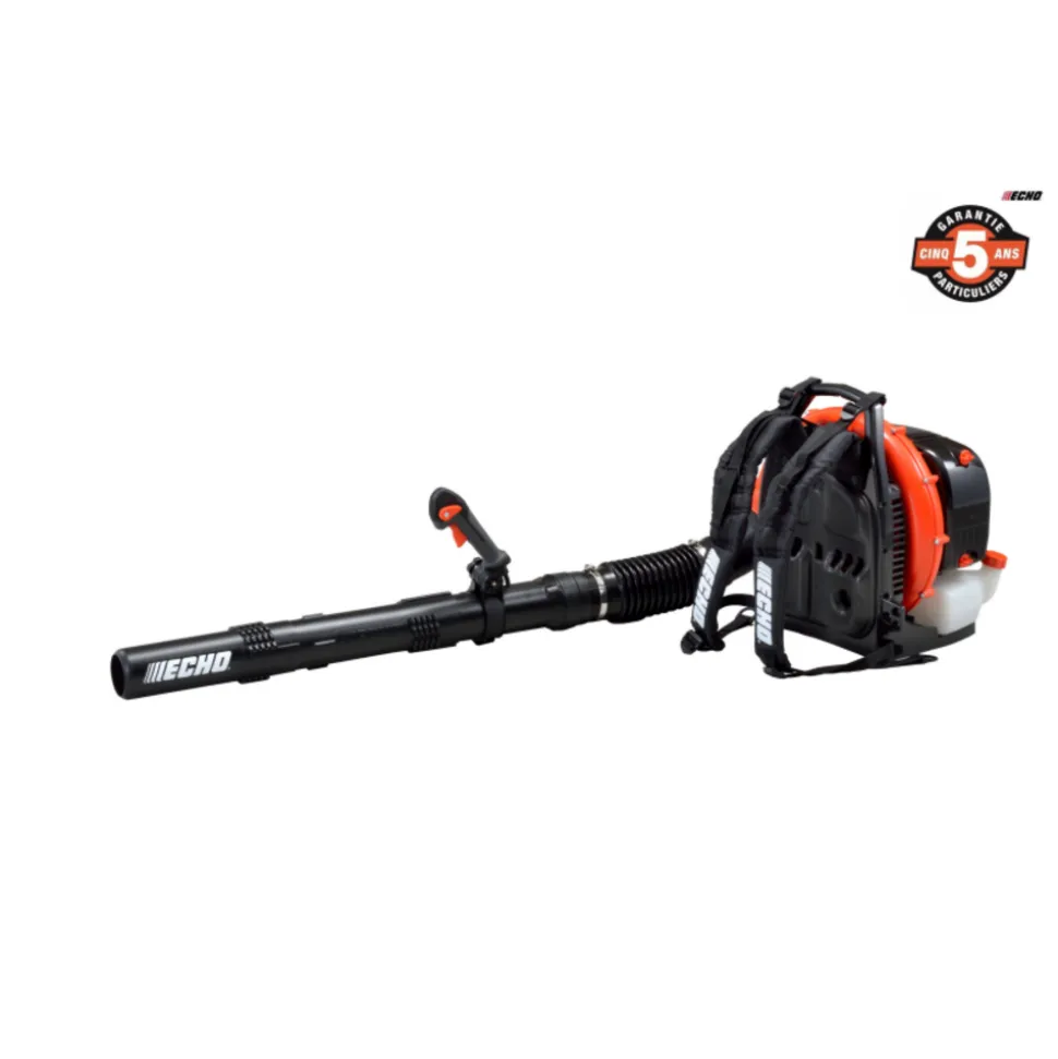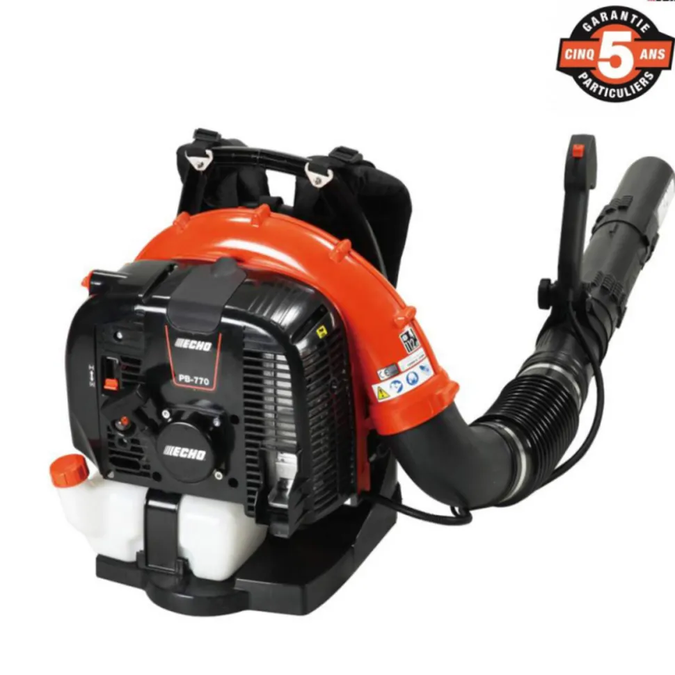 Souffleur à dos thermique PB-770 de la marque ECHO Le souffleur à dos PB-770 est le plus puissant de la gamme des souffleurs à dos avec sa puissance de 3.05kW et sa cylindrée de 63.3 cm³. Il a été conçu pour un usage professionnel grâce à ses nombreuses fonctionnalités et peut aussi déblayer tous type de terrains comportant des feuilles et débris grâce a son filtre à air Heavy Duty. Les avantages : Cylindrée : 63.3 cm³ Type de moteur : 2 temps Couvercle à double couche réduisant le bruit du moteur Système anti-vibration Filtre à air Heavy Duty Armure ventilé Système de fixation ‘Posi-Loc’ Harnais de maintiens assurant confort et isolation Module d’allumage à commande numérique ‘Digital CDI’ Garantie 5 ans pour les particuliers et 2 ans pour les professionnelSouffleur thermique à dos ECHO – PB-770 Ce souffleur s’adapte à tous vos besoins grâce à ses 2 embouts en rond droit et courbé qui se change rapidement et facilement. Le PB-770 est un souffleur conçu pour maximiser l’efficacité et le confort donc pour rendre le travail plus rapide et moins épuisant grâce à son moteur qui est le plus puissance moteur de la marque ECHO et grâce à son système anti-vibration qui rend l’utilisation plus confortable. De plus, il possède un excellent rapport poids/puissance avec ses 11 kg pour 3.05 kW. Le produit contient un variateur de vitesse offrant la possibilité de régler avec précision la puissance dont vous avez besoin. Caractéristiques techniques : Cylindrée : 63.3 cm³ Puissance : 3.05 kW Poids à sec : 11 kg Capacité du réservoir : 2.02 l Consommation de carburant à la puissance maximale : 1.87 l Force de souffle : 33.2 N Volume d’air : 882 m³/h Vitesse max de l’air : 104.6 m/s Garantie incluse : Comme tous les outils ECHO, le DHCS-2800 est couvert par une garantie de 5 ans pour les particuliers et de 2 ans pour les professionnels.