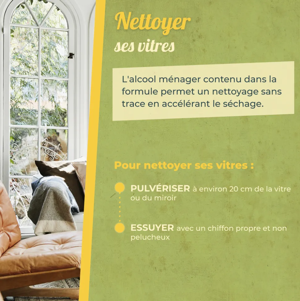 Pour nettoyer ses vitres au chiffon : pulvérisez à environ 20 cm de la vitre, sans surcharger puis essuyez avec un chiffon propre et non pelucheux. Pour nettoyer ses vitres à la raclette : étalez le produit à l’aide d’une éponge en insistant sur les salissures puis passez la raclette.