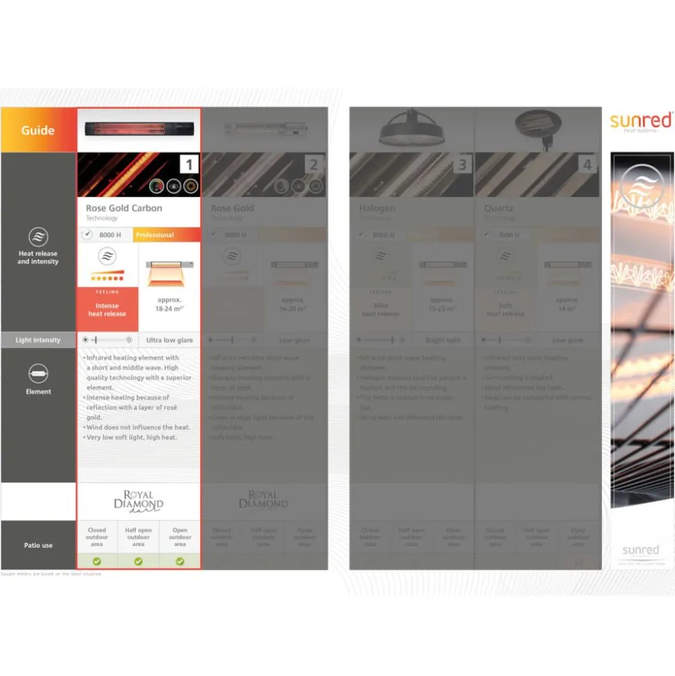 Combinez style de vie et confort avec le chauffage de patio Royal Diamond Dark de la marque Sunred parfait pour une utilisation sur la terrasse, dans le jardin ou sur le balcon. Vous pouvez inviter vos amis et votre famille à une fête et leur souhaiter une chaleureuse bienvenue ! Ce chauffage a une puissance d’entrée maximale de 3 000 W et un beau design mince avec une finition en couche noire. L’élément chauffant de Royal Diamond Dark peut être réglé sur faible (1 500 W) ou élevé (1 500 W) ou avec les deux lampes allumées (3 000 W). Le chauffage d’extérieur de la marque Sunred doté d’un élément chauffant infrarouge en fibre de carbone avec une finition de revêtement rosé de couche de feuille d’or sur le tube chauffant. De cette façon, vous pouvez ressentir une chaleur intense avec un éblouissement léger minimal. Il a une portée opérationnelle d’environ 29 m². Il est facile de le déplacer à l’extérieur. De plus, ce chauffage de terrasse bénéficie d’une protection anti-basculement. Lorsqu’il n’est pas utilisé, vous pouvez utiliser une housse de protection fournie avec le chauffage pour le protéger de la poussière.