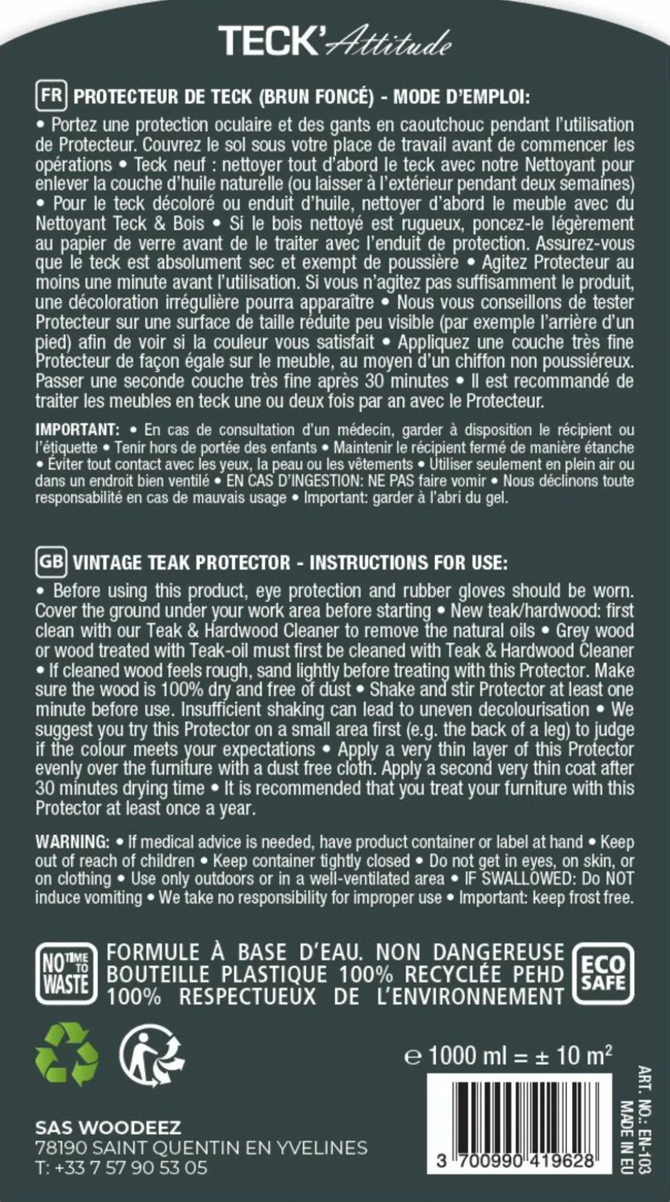 La formule non grasse à base d’eau permet d’éviter les taches noires souvent observées avec l’utilisation de l’huile pour teck.