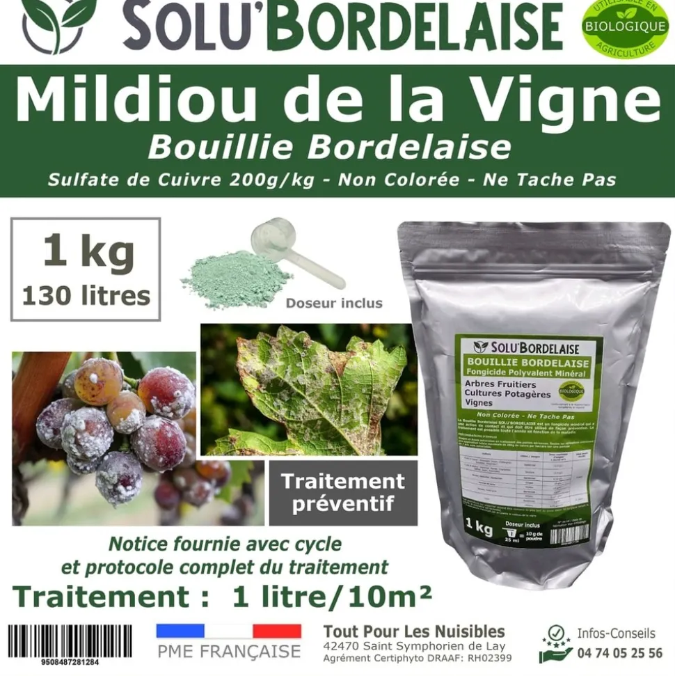 Solu’Bordelaise est un produit minéral à base de sulfate de cuivre (200 g/kg de cuivre métal). Elle agit par contact en créant une barrière protectrice efficace sur les feuilles et les grappes, limitant la germination et la propagation des spores du Mildiou.