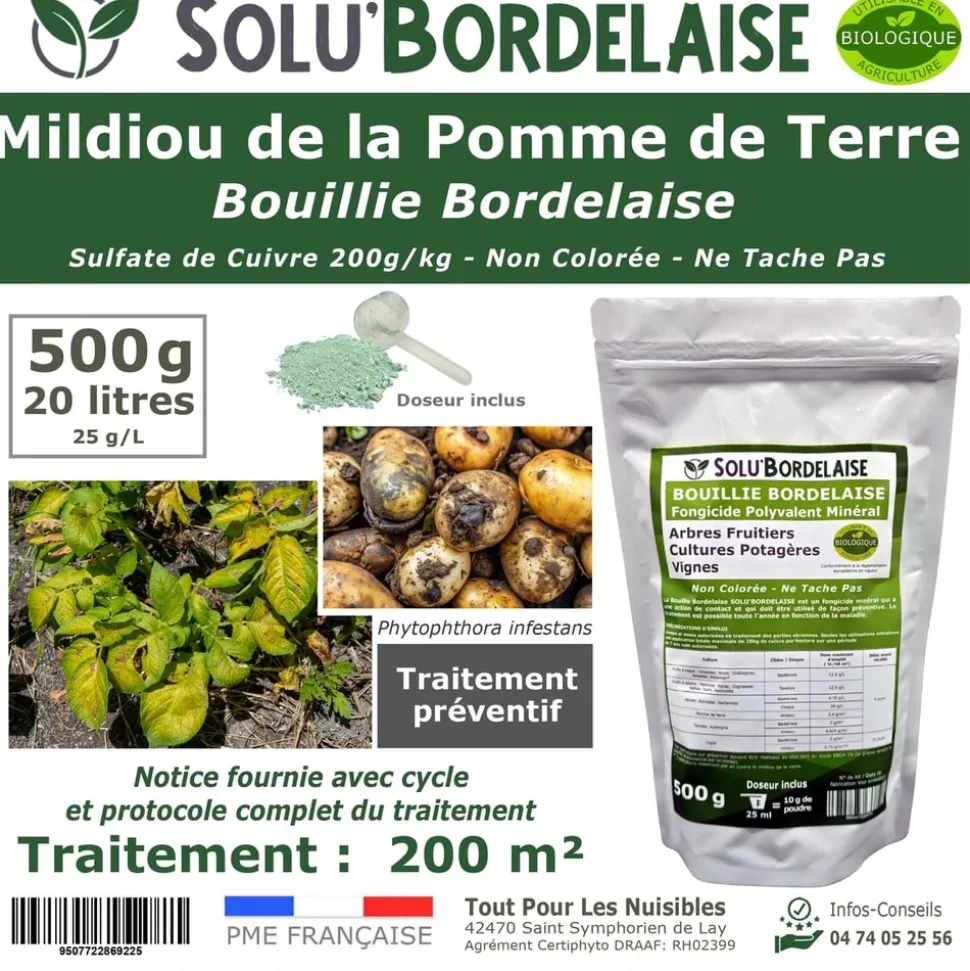 Solu’Bordelaise est une bouillie bordelaise non colorée composée de 200 g/kg de cuivre métal sous forme de sulfate de cuivre. Elle agit par contact en formant une barrière protectrice empêchant la germination des spores et limitant efficacement la propagation du champignon.