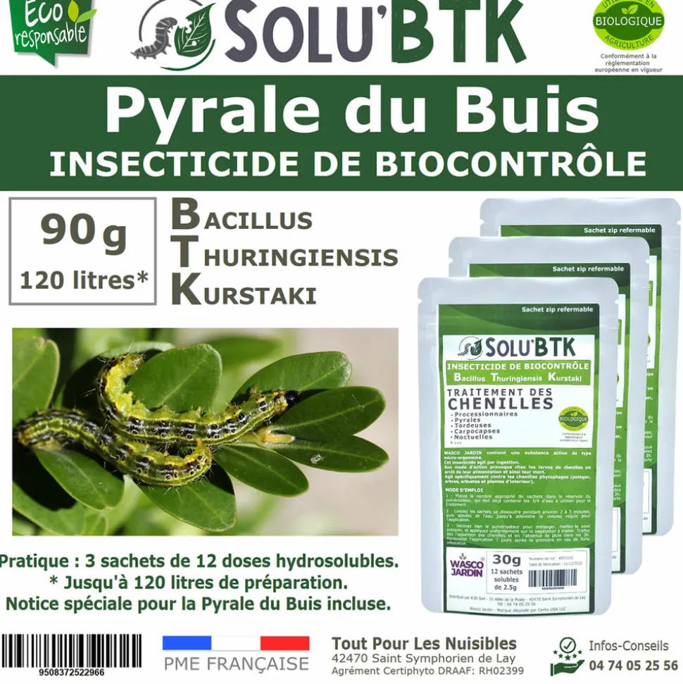 Instructions : Laissez dissoudre les doses dans l’eau pendant 3 minutes, agitez fortement le pulvérisateur et appliquez sur les feuilles de buis lorsque la pyrale est au stade de chenille pour une protection optimale.