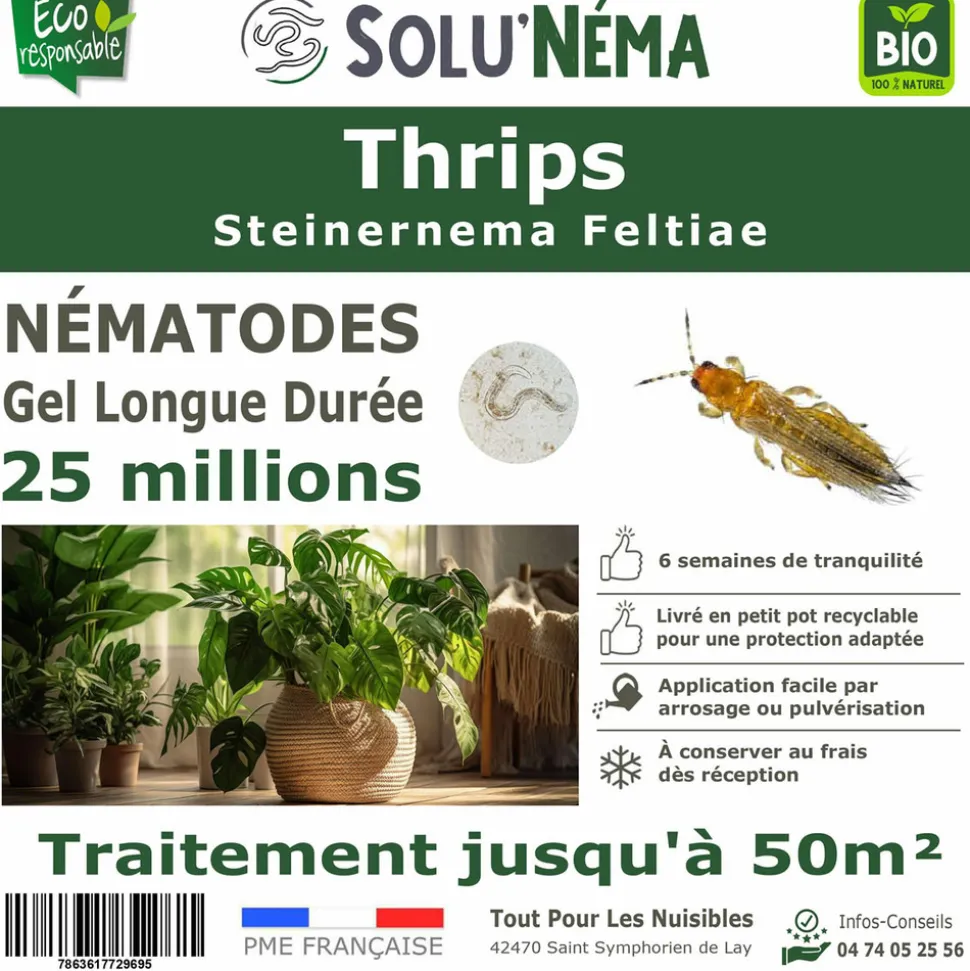 Les nematodes Steinernema feltiae sont des vers minuscules qui vivent dans le sol et qui sont naturellement prédateurs des thrips.