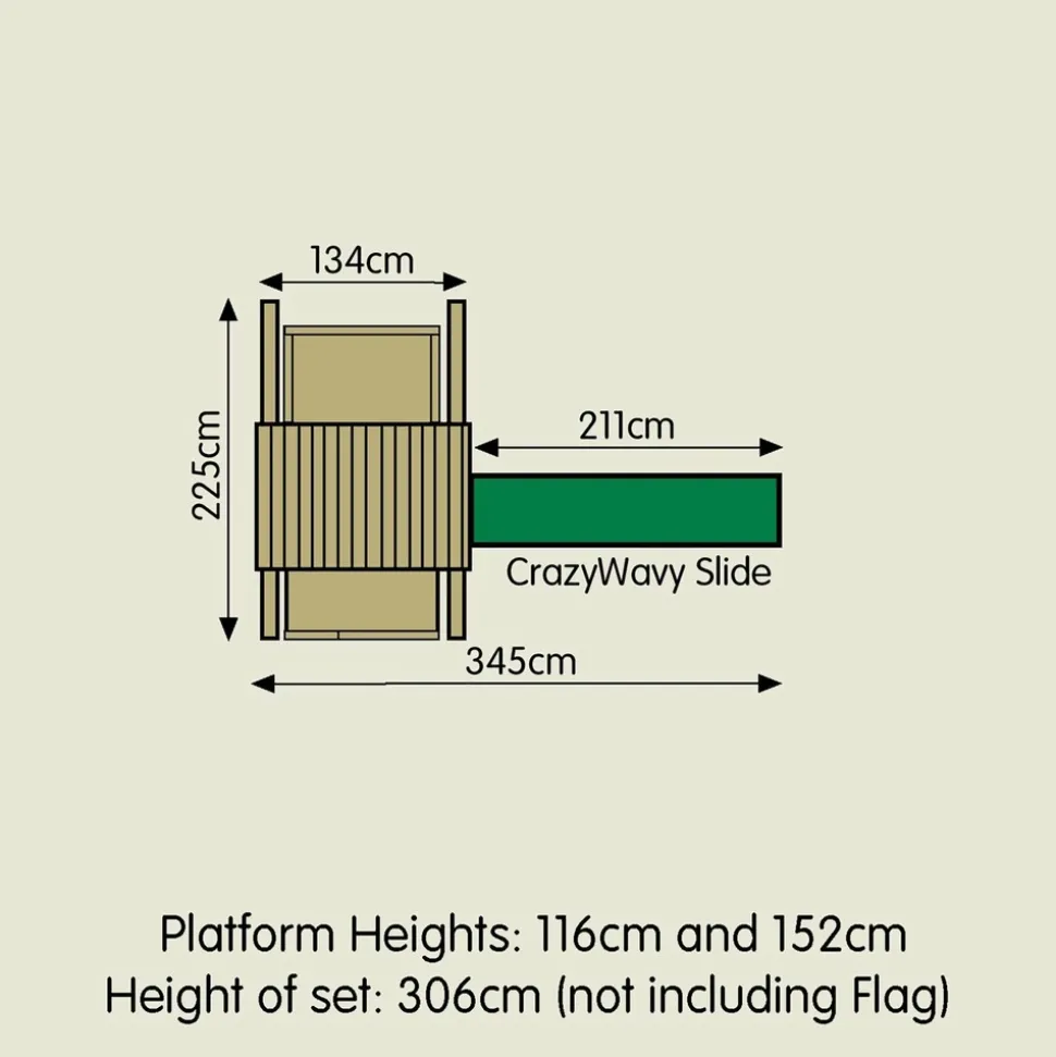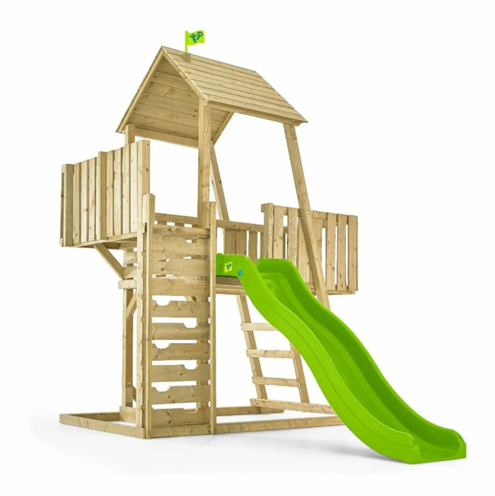 Cette impressionnante tour en bois Kingswood à escalader comprend un toboggan TP TOYS Double Vague et également une échelle intérieure menant au belvédère et à une deuxième plateforme.