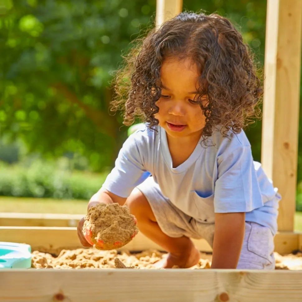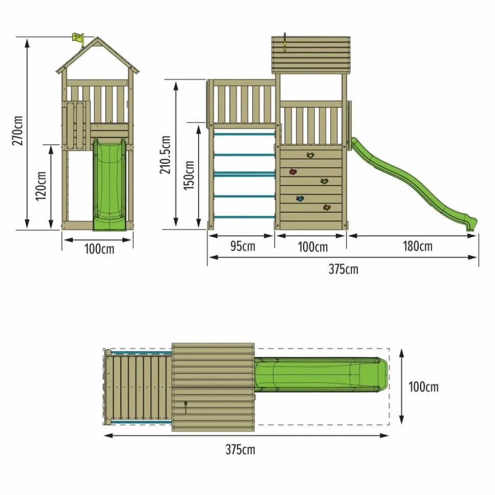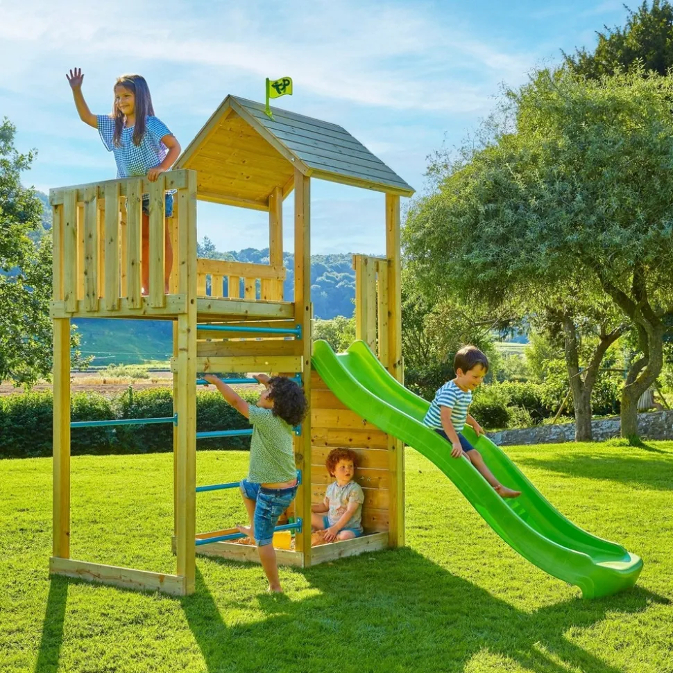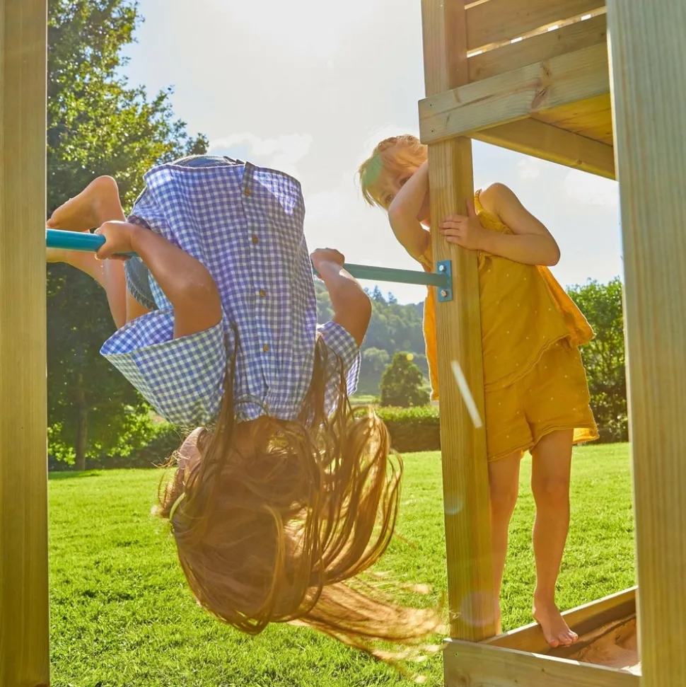 Avec une plateforme de 1,2 m de haut accessible par une échelle ou un mur d’escalade, couvrant un bac à sable ombragé, la tour de jeu Skywood avec toboggan de 2,5 m sera un paradis pour les enfants !