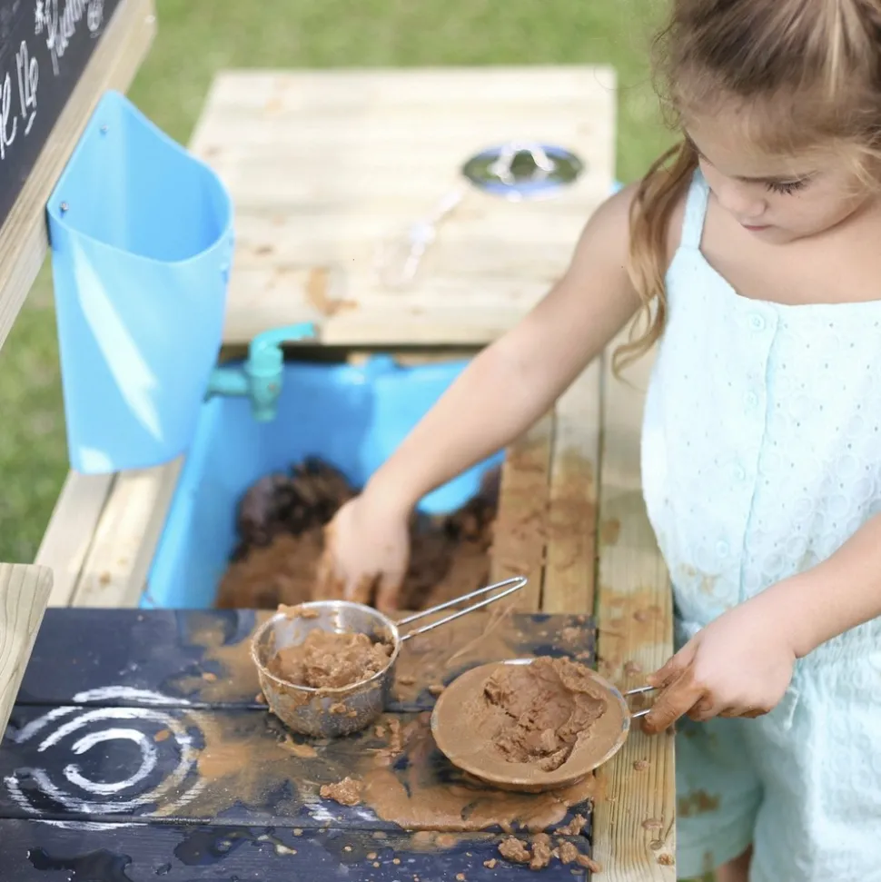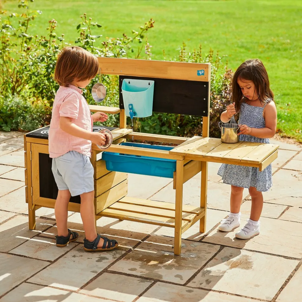 Découvrez la cuisine TP Deluxe fabriquée en bois et regorgeant de caractéristiques plus ludiques les unes que les autres : une bassine spacieuse et robuste, un réservoir à eau rechargeable et un véritable robinet pour mélanger la boue encore plus facilement…