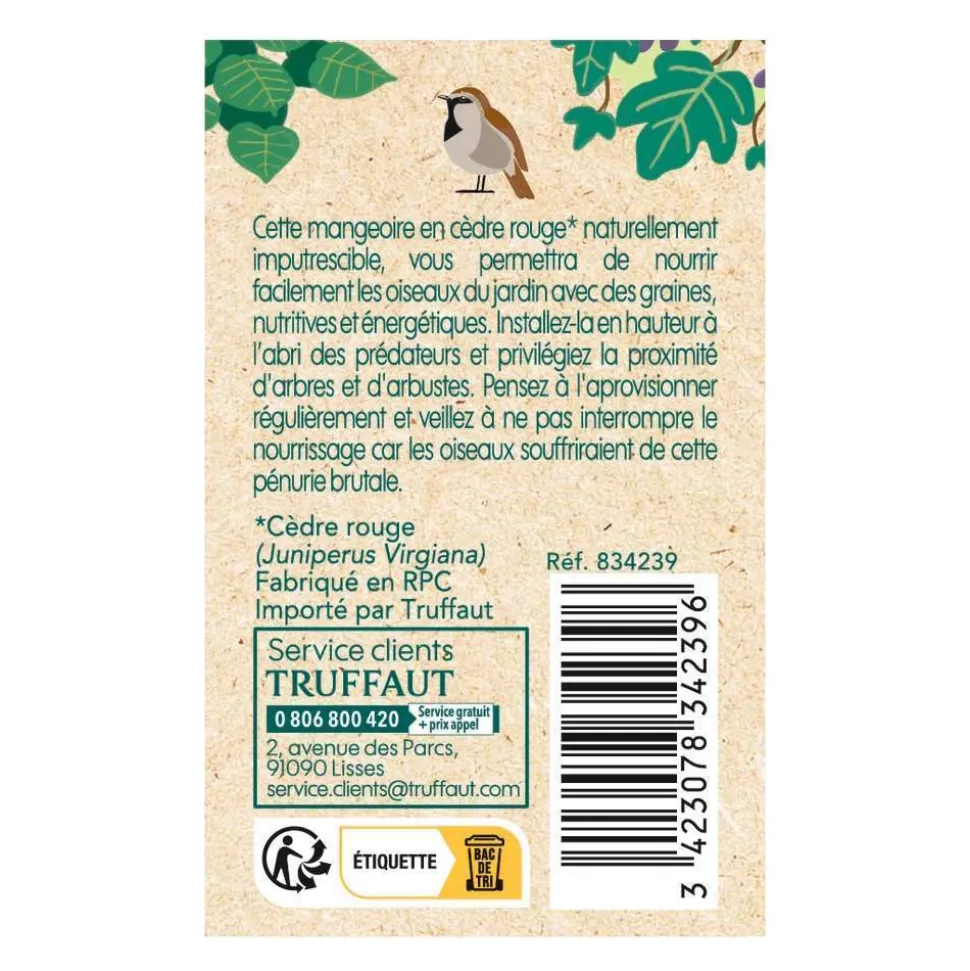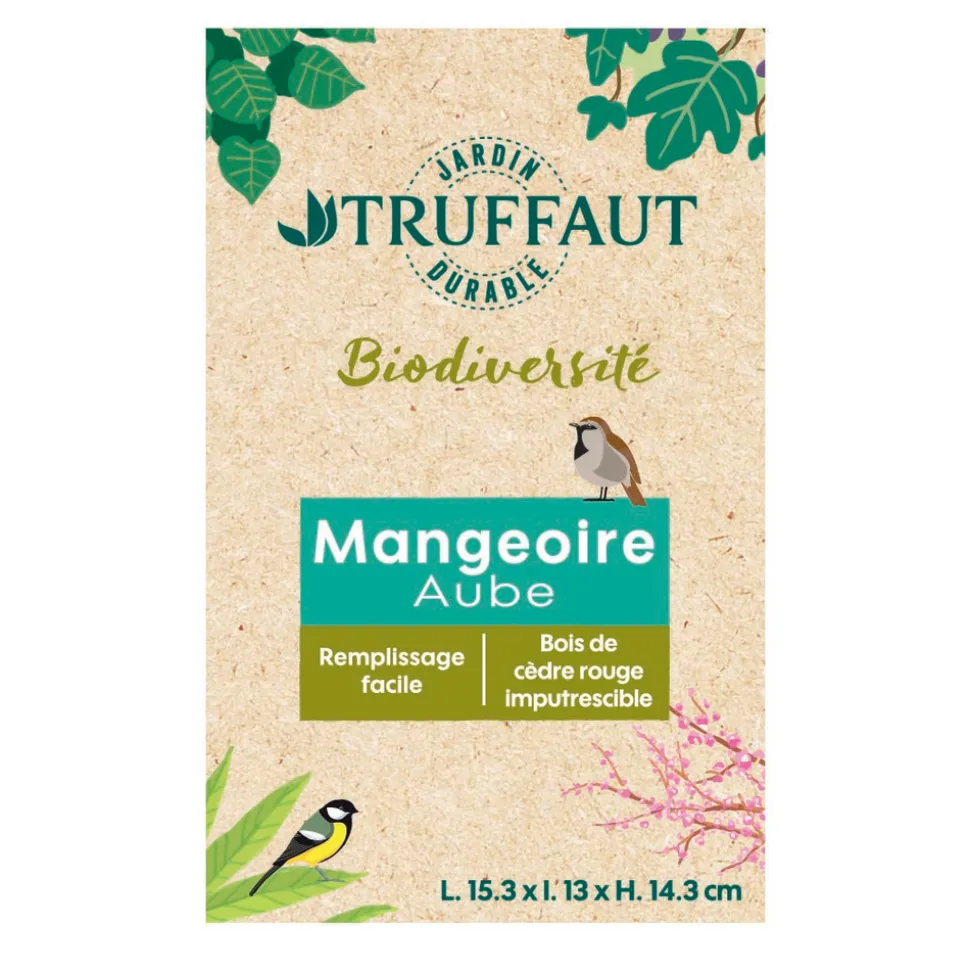 La petit modèle de mangeoire Aube en bois de cèdre vous permettra d’offrir de délicieux repas aux oiseaux de votre jardin. En hiver, les oiseaux sauvages dépensent beaucoup d’énergie pour trouver de la nourriture. En leur proposant des graines ou des boules de graisse, vous leur permettez de survivre. Si vous accrochez la mangeoire Aube près d’une fenêtre, vous pourrez profiter du joli spectacle des oiseaux venant s’y nourrir. La mangeoire peut aussi s’accrocher à une branche d’arbre ou à une patère grâce à sa poignée.