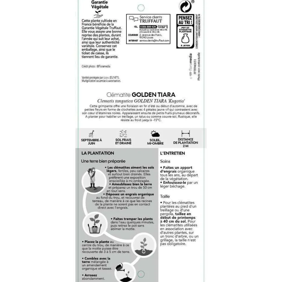 Le genre Clematis comprend environ 300 espèces, originaires de l’hémisphère Nord et d’Australie. Clematis tangutica est l’une de ces espèces, originaire de Mongolie et du Nord de la Chine.’Golden Tiara(R)Kugotia’ est une variété horticole.La clématite ‘Golden Tiara(R)Kugotia’ est une clématite à fleur simple en clochette, dont la corolle se compose de 4 pétales épais, solides, jaunes en contraste avec un coeur d’étamines noires. Elle fleurit en juillet puis en septembre-octobre.