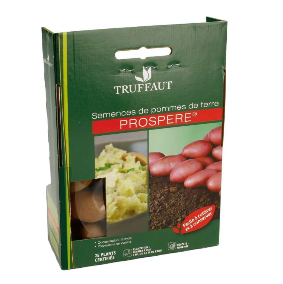 La pomme de terre Prospere calibre 25/35 est une variété particulièrement polyvalente pour les gastronomes, vous pouvez la cuisiner sautée, vapeur, en frites, en potages ou en purée, sans qu’elle ne perde rien de sa texture ni de ses qualités. Parfaite en conservation, vous pouvez la conserver 6 à 8 mois d’affilée sans qu’elle perde sa fermeté. Conditionnement : 25 plants