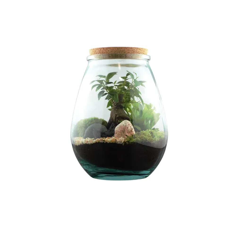 Terrarium en verre avec Ginseng. Le Ficus Microcarpa est aussi appelé couramment Ficus Ginseng. Du fait de sa petite taille et de sa forme très tourmentée, il se présente comme un bonsaï. Il produit de petites feuilles, coriaces, persistantes, vert clair à l’aspect vernissé. Son tronc à sa base, composé d’un ensemble de racines aériennes est à la fois épais et grisâtre. Les plantes installées dans un terrarium en verre, nécessitent peu d’entretien. Le contenant lorsqu’il est fermé favorise d’une part la photosynthèse et d’autre part le cycle de l’eau. C’est un écosystème qui se suffit à lui-même. Le jour, sous l’action de la photosynthèse, la plante absorbe le dioxyde de carbone et rejette de l’oxygène, la nuit le phénomène s’inverse. Cette action diurne, entraine aussi l’apparition de condensation qui apportera aux plantes l’eau nécessaire à leur croissance.
