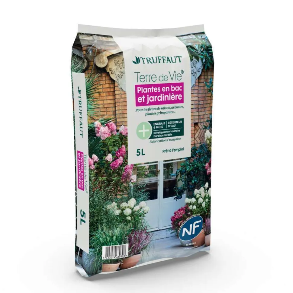 Ce terreau a été spécialement conçu pour répondre aux besoins des plantes fleuries (géraniums, bégonias, pétunias, pensées…) cultivées en jardinières. Sa formule contient un rétenteur d’eau naturel. (5L)