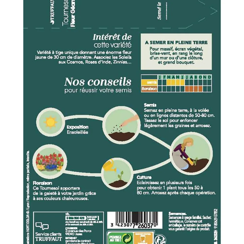 Ces graines de tournesol à fleurs géantes mettront de l’originalité et de la couleur dans votre jardin. Elles vous donneront d’énormes fleurs aux tiges rigides et aux feuilles amples et rudes. Ses pétales jaunes et son coeur noir parfois rouge brun orneront vos extérieurs et seront du plus bel effet. Cette plante peu exigeante supportera les terrains secs. Elle agrémentera les fonds de massifs de fleurs annuelles plus basses et sera également parfaite en bouquet.