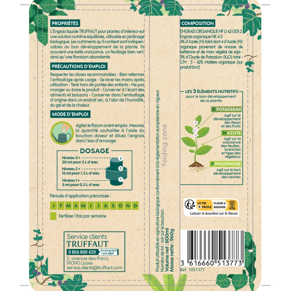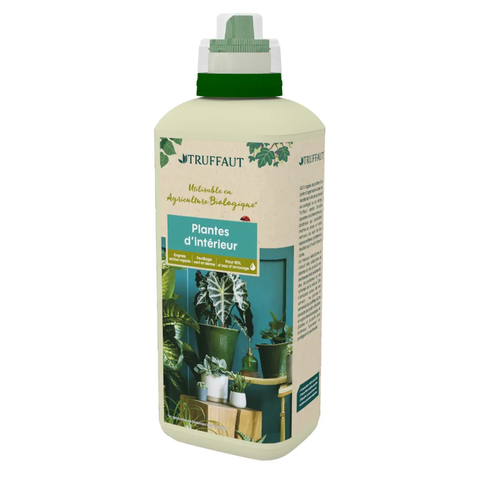 L鈥橢ngrais liquide TRUFFAUT pour plantes d鈥檌ntérieur est une solution nutritive équilibrée, utilisable en jardinage biologique. Les nutriments qu’il contient sont indispensables au bon développement de la plante. Ils assurent une belle croissance, un feuillage bien vert, ainsi qu’une floraison abondante. Disponible en flacon de 400ml pour 40L d’eau d’arrosage ou en flacon de 800ml pour 80L d’eau d’arrosage. Engrais liquide Truffaut plantes d鈥檌ntérieur 800 ml.
